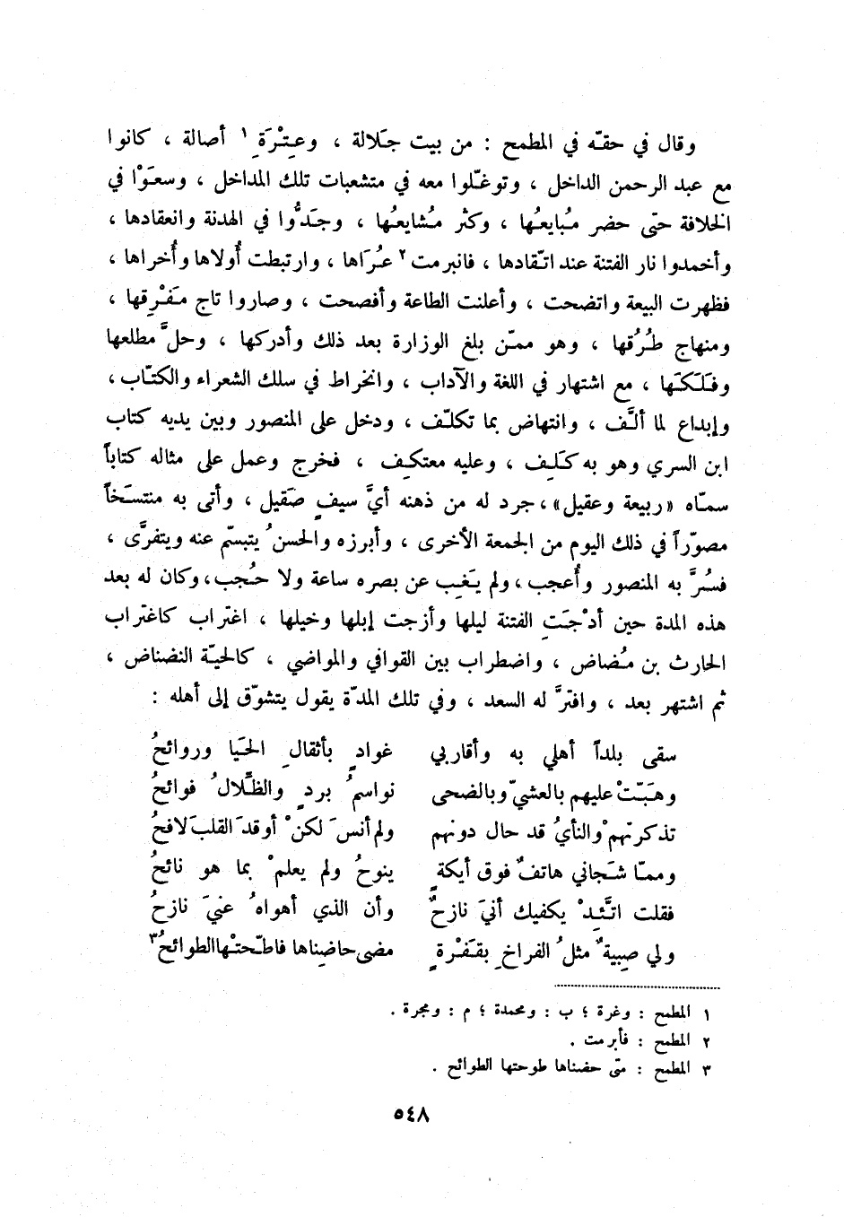 وقال في حقه في المطمح: من بيت جلالة، وعترة (1) أصالة، كانوا مع عبد الرحمن الداخل، وتوغلوا معه في متشعبات تلك المداخل، وسعوا في الخلافة حتى حضر مبايعها، وكثر مشايعها، وجدوا في الهدنة وانعقادها، وأخمدوا نار الفتنة عند اتقادها، فانبرمت (2) عراها، وارتبطت أولاها وأخراها، فظهرت البيعة واتضحت، وأعلنت الطاعة وأفصحت، وصاروا تاج مفرقها، ومنهاج طرقها، وهو ممن بلغ الوزارة بعد ذلك وأدركها، وحل مطلعها وفلكها، مع اشتهار في اللغة والآداب، وانخراط في سلك الشعراء والكتاب، وإبداع لما ألف، وانتهاض بما تكلف، ودخل على المنصور وبين يديه كتاب ابن السري وهو به كلف، وعليه معتكف، فخرج وعمل على مثاله كتاباً، سماه " ربيعة وعقيل "، جرد له من ذهنه أي سيفٍ صقيل، وأتى به منتسخاً مصوراً في ذلك اليوم من الجمعة الأخرى، وأبرزه والحسن يتبسم عنه ويتفرى، فسر به المنصور وأعجب، ولم يغب عن بصره ساعة ولا حجب، وكان له بعد هذه المدة حين أدجت الفتنة ليلها وأزجت إبلها وخيلها، اغتراب كاغتراب الحارث بن مضاض، واضطراب بين القوافي والمواضي، كالحية النضاض، ثم اشتهر بعد، وافتر له السعد، وفي تلك المدة يقول يتشوق إلى أهله: