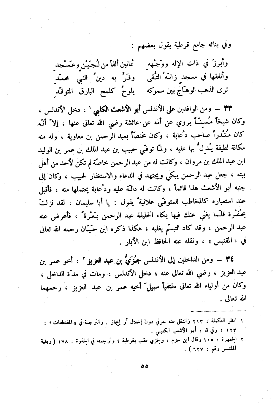 ترى الذهب الوهّاج بين سموكه ... يلوح كلمح البارق المتوقّد 33 - ومن الوافدين على الأندلس أبو الأشعث الكلبي (1) ، دخل الأندلس، وكان شيخاً مسناً يروي عن أمه عن عائشة رضي الله تعالى عنها، إلا أنه كان مندراً صاحب دعابة، وكان مختصاً بعبد الرحمن بن معاوية، وله منه مكانةٌ لطيفةٌ يدل بها عليه، ولما توفي حبيب بن عبد الملك بن عمر بن الوليد ابن عبد الملك بن مروان، وكانت له من عبد الرحمن خاصةٌ لم تكن لأحد من أهل بيته، جعل عبد الرحمن يبكي ويجتهد في الدعاء والاستغفار لحبيب، وكان إلى جنبه أبو الأشعث هذا قائماً، وكانت له دالة عليه ودعابة يحتملها منه، فأقبل عند استعباره كالمخاطب للمتوفى علانيةً يقول: يا أبا سليمان، لقد نزلت بحفرة قلما يغني عنك فيها بكاء الخليفة عبد الرحمن بعرةً، فأعرض عنه عبد الرحمن، وقد كاد التبسم يغلبه؛ هكذا ذكره ابن حيان رحمه الله تعالى في " المقتبس "، ونقله عن الحافظ ابن الأبار.