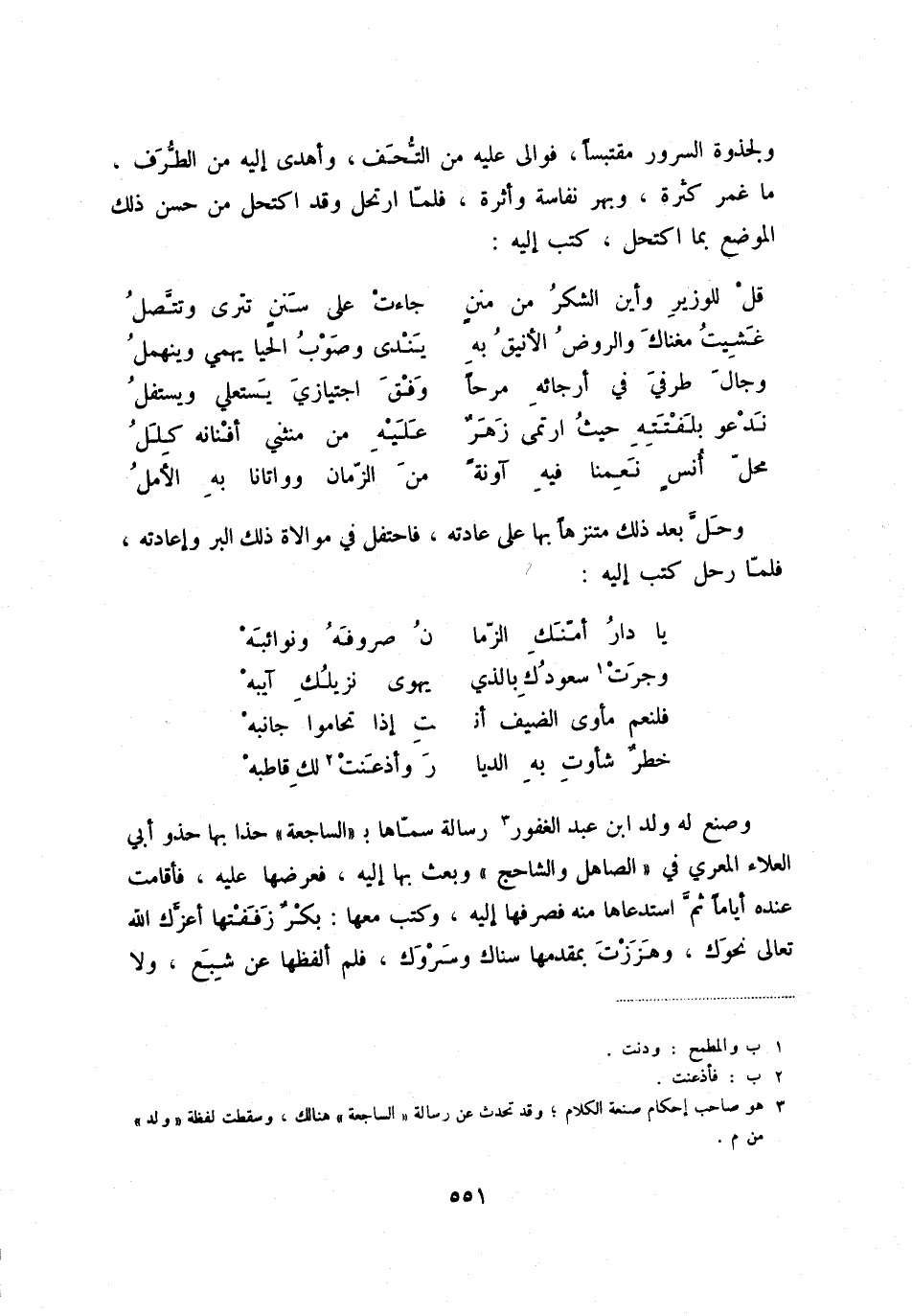 (3) هو صاحب إحكام صنعة الكلام؛ وقد تحدث عن رسالة " الساجعة " هنالك، وسقطت لفظة " ولد " من م.
