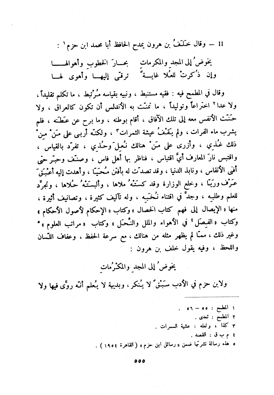 11 - وقال خلف بن هرون يمدح الحافظ أبا محمد ابن حزام (1) :