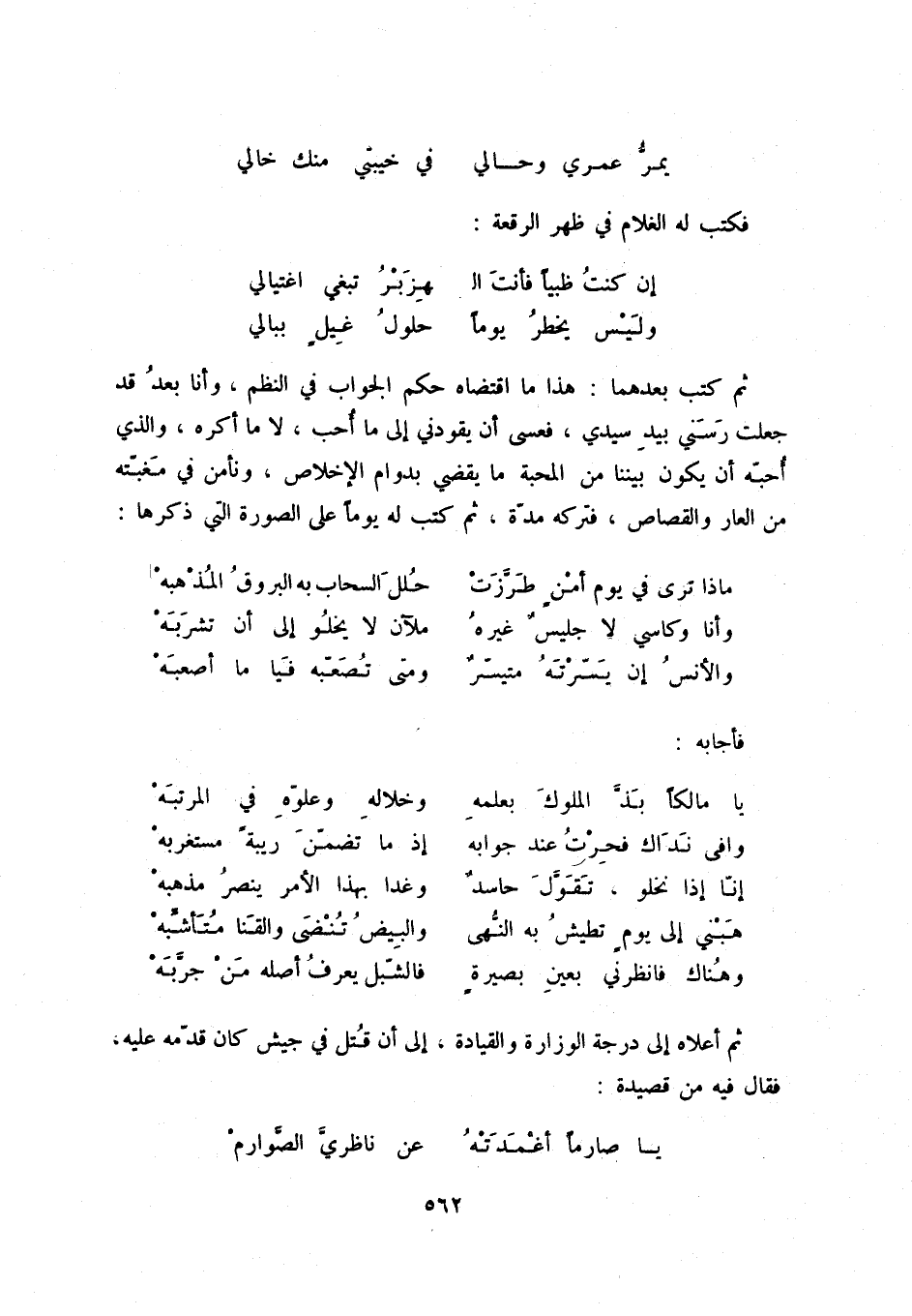 وهناك فانظرني بعين بصيرةٍ ... فالشّبل يعرف أصله من جرّبه ثم أعلاه إلى درجة الوزارة والقيادة، إلى أن قتل في جيش كان قدمه عليه، فقال فيه من قصيدة: