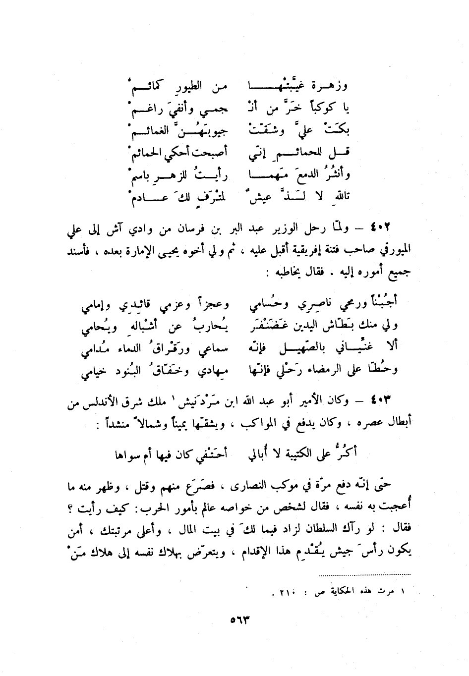 وحطّا على الرمضاء رحلي فإنّها ... مهادي وخفّاق البنود خيامي 403 - وكان الأمير أبو عبد الله ابن مردنيش (1) ملك شرق الأندلس من أبطال عصره، وكان يدفع في المواكب، ويشقها يميناً وشمالاً منشداً: