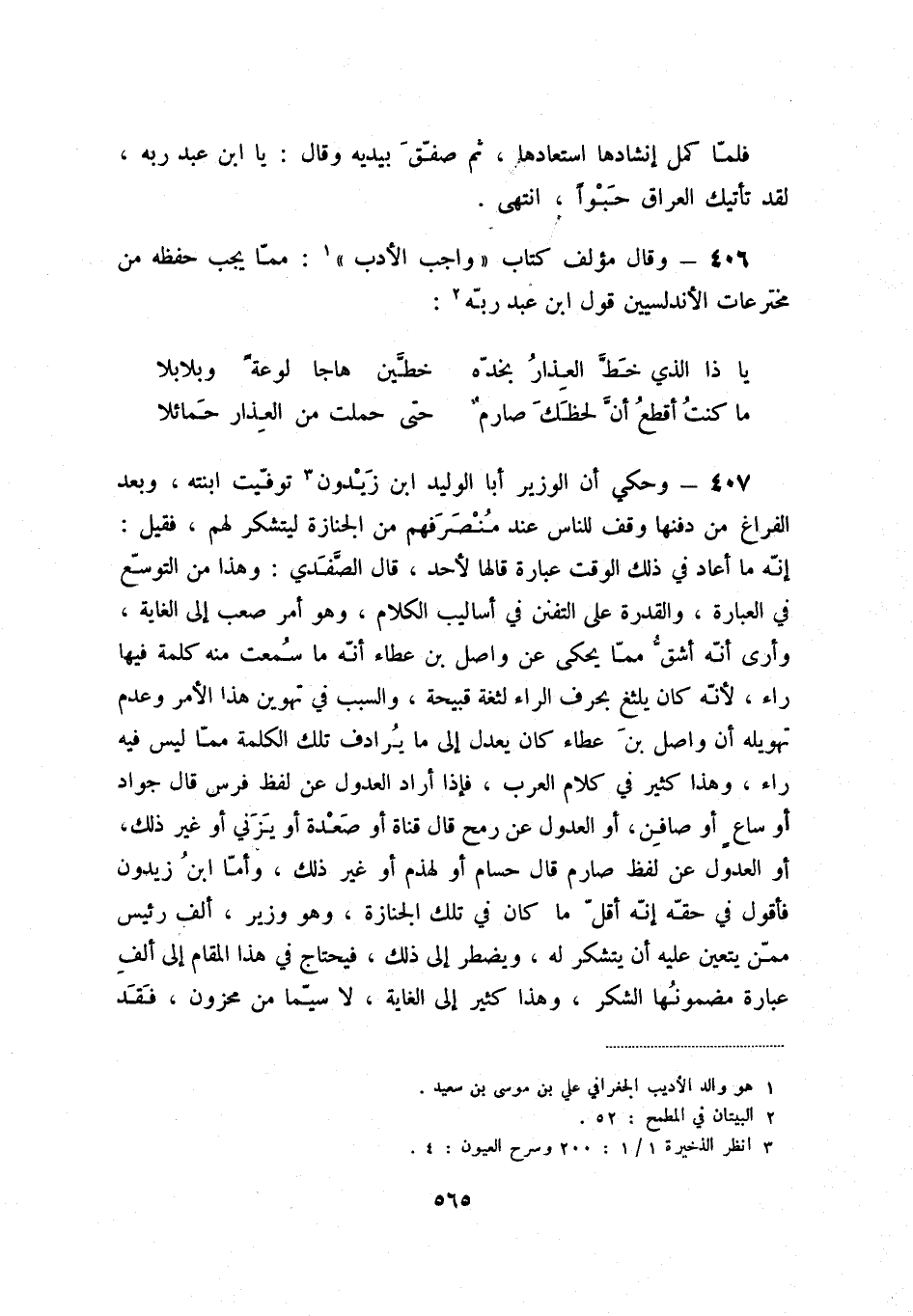 ما كنت أقطع أنّ لحظك صارمٌ ... حتى حملت من العذار حمائلا 407 - وحكي أن الوزير أبا الوليد ابن زيدون (3) توفيت ابنته، وبعد الفراغ من دفنها وقف للناس عند منصرفهم من الجنازة ليتشكر لهم، فقيل: إنه ما أعاد في ذلك الوقت عبارة قالها لأحد، قال الصفدي: وهذا من التوسع في العبارة، والقدرة على التفنن في أساليب الكلام، وهو أمر صعب إلى الغاية، وأرى أنه أشق مما يحكى عن واصل بن عطاء أنه ما سمعت منه كلمة فيها راء، لأنه كان يلثغ بحرف الراء لثغة قبيحة، والسبب في تهوين هذا الأمر وعدم تهويله أن واصل بن عطاء كان يعدل إلى ما يرادف تلك الكلمة مما ليس فيه راء، وهذا كثير في كلام العرب، فإذا أراد العدول عن لفظ فرس قال جواد أو ساعٍ أو صافن، أو العدول عن رمح قال قناة أو صعدة أو يزني أو غير ذلك، أو العدول عن لفظ صارم قال حسام أو لهذم أو غير ذلك، وأما ابن زيدون فأقول في حقه إنه أقل ما كان في تلك الجنازة، وهو وزير، ألف رئيس ممن يتعين عليه أن يتشكر له، ويضطر إلى ذلك، فيحتاج في هذا المقام إلى ألف عبارة مضمونها الشكر، وهذا كثير إلى الغاية، لا سيما من محزون، فقد