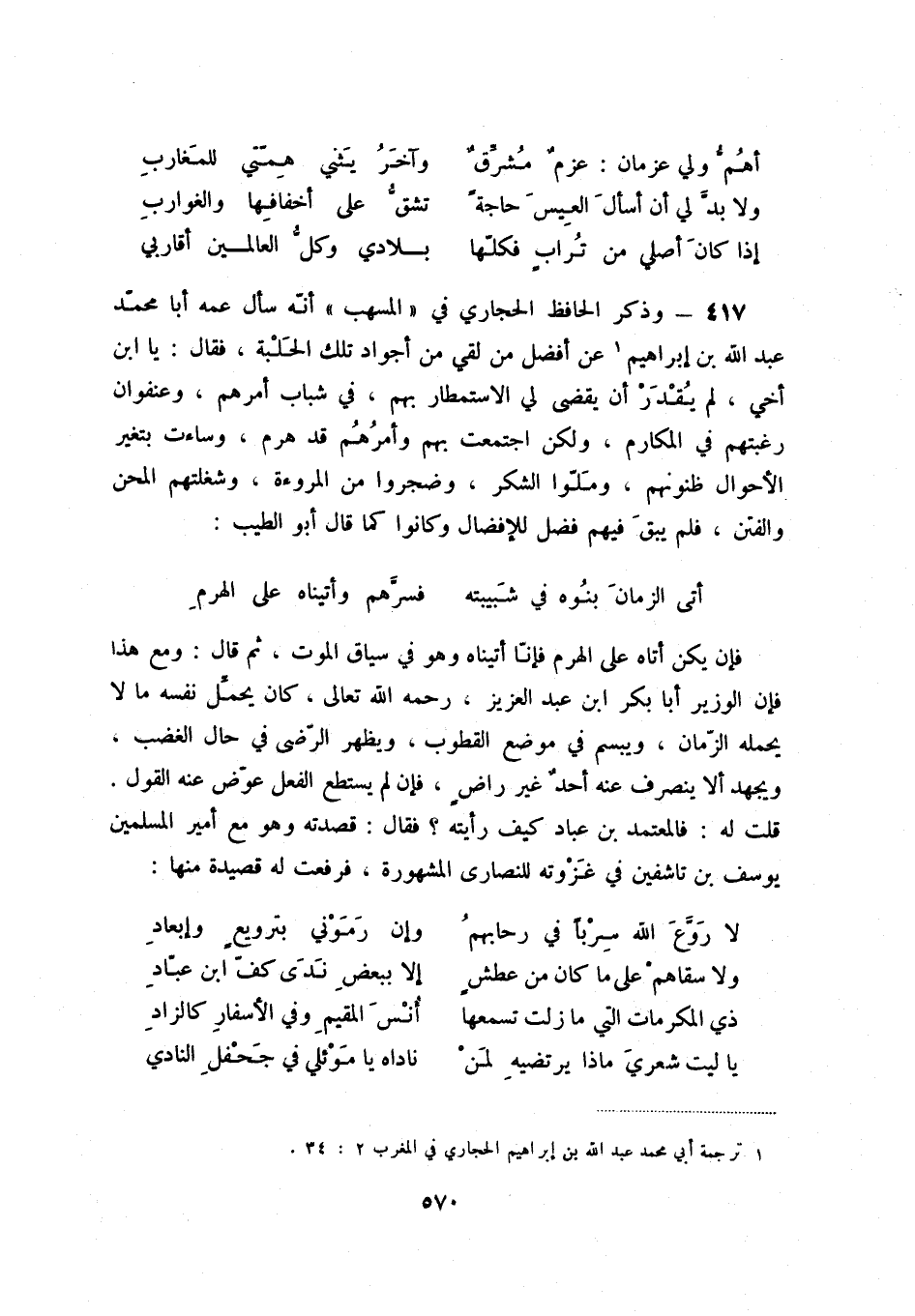إذا كان أصلي من ترابٍ فكلّها ... بلادي وكلّ العالمين أقاربي 417 - وذكر الحافظ الحجاري في " المسهب " أنه سأل عمه أبا محمد عبد الله بن إبراهيم (1) عن أفضل من لقي من أجواد تلك الحلبة، فقال: ياابن أخي، لم يقدر أن يقضي لي الاستمطار بهم، في شباب أمرهم قد هرم، وساءت بتغير الأحوال ظنونهم، وملوا الشكر، وضجروا من المروءة، وشغلتهم المحن والفتن، فلم يبق فيهم فضل للإفضال وكانوا كما قال أبو الطيب: