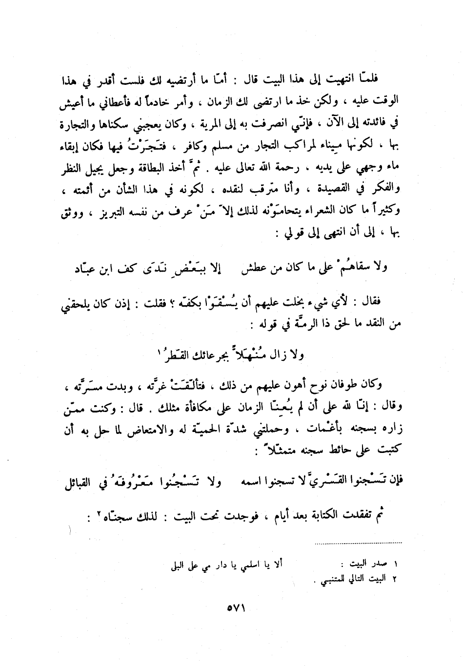 فإن تسجنوا القسريّ لا تسجنوا اسمه ... ولا تسجنوا معروفه في القبائل ثم تفقدت الكتابة بعد أيام، فوجدت تحت البيت: لذلك سجناه (2) :