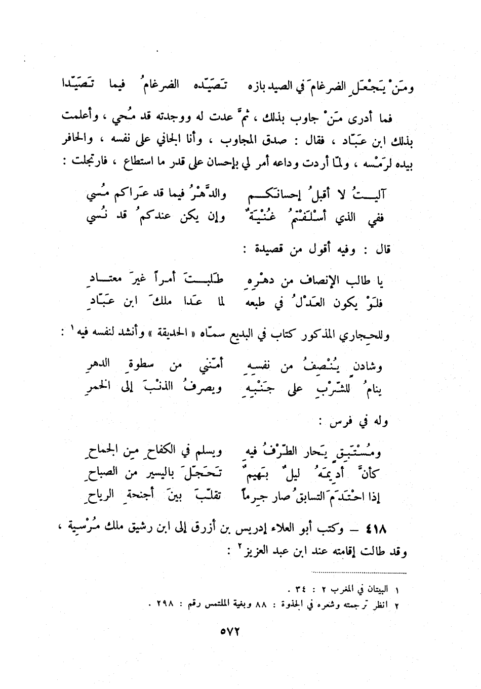 إذا احتدم التسابق صار جرماً ... تقلّب بين أجنحة الرياح 418 - وكتب أبو العلاء إدريس بن أزرق إلى ابن رشيق ملك مرسية، وقد طالت إقامته عند ابن عبد العزيز (2) :