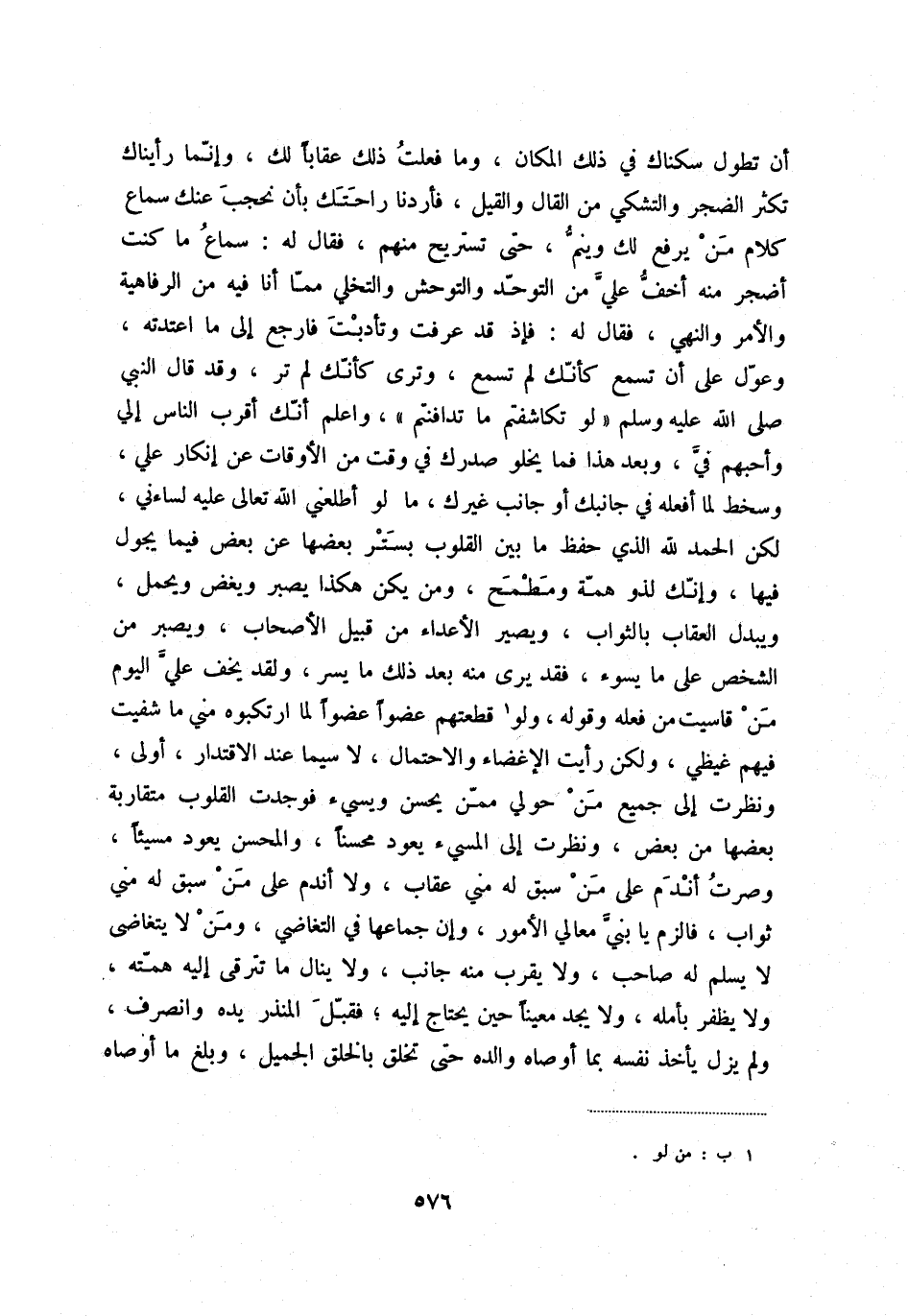 أن تطول سكناك في ذلك المكان، ومافعلت ذلك عقاباً لك، وإنما رأيناك تكثر الضجر والتشكي من القال والقيل، فأردنا راحتك بأن نحجب عنك سماع كلام من يرفع لك وينم، حتى تستريح منهم، فقال له: سماع ما كنت أضجر منه أخف علي من التوحد والتوحش والتخلي مماأنا فيه من الرفاهية والأمر والنهي، فقال له: فإذ قد عرفت وتأدبت فارجع إلى ما اعتدته، وعول على أن تسمع كأنك لم تسمع، وترى كأنك لم تر، وقد قال النبي صلى الله عليه وسلم " لو تكاشفتم ما تدافنتم "، واعلم أنك أقرب الناس إلي وأحبهم في، وبعد هذا فما يخلو صدرك في وقت من الأوقات عن إنكار علي، وسخط لما أفعله في جانبك أو جانب غيرك، ما لو أطلعني الله تعالى عليه لساءني، لكن الحمد لله الذي حفظ ما بين القلوب بستر بعضها عن بعض فيما يجول فيها، وإنك لذو همة ومطمح، ومن يكن هكذا يصبر ويغض ويحمل، ويبدل العقاب بالثواب، ويصير الأعداء من قبيل الأصحاب، ويصبر من الشخص على ما يسوء، فقد يرى منه بعد ذلك ما يسر، ولقد يخف علي اليوم من قاسيت من فعله وقوله، ولو (1) قطعتهم عضواً عضواً لما ارتكبوه مني ما شفيت فيهم غيظي، ولكن رأيت الإغضاء والاحتمال، لا سيما عند الاقتدار، أولى، ونظرت إلى جميع من حولي ممن يحسن ويسيء فوجدت القلوب متقاربة بعضها من بعض، ونظرت إلى المسيء يعود محسناً، والمحسن يعود مسيئاً، وصرت أندم على من سبق له مني عقاب، ولا أندم على من سبق له مني ثواب، فالزم يا بني معالي الأمور، وإن جماعها في التغاضي، ومن لا يتغاضى لا يسلم له صاحب، ولا يقرب منه جانب، ولا ينال ما تترقى إليه همته، ولا يظفر بأمله، ولا يجد معيناً حين يحتاج إليه، فقبل المنذر يده وانصرف، ولم يزل يأخذ نفسه بما أوصاه والده حتى تخلق بالخلق الجميل، وبلغ ما أوصاه