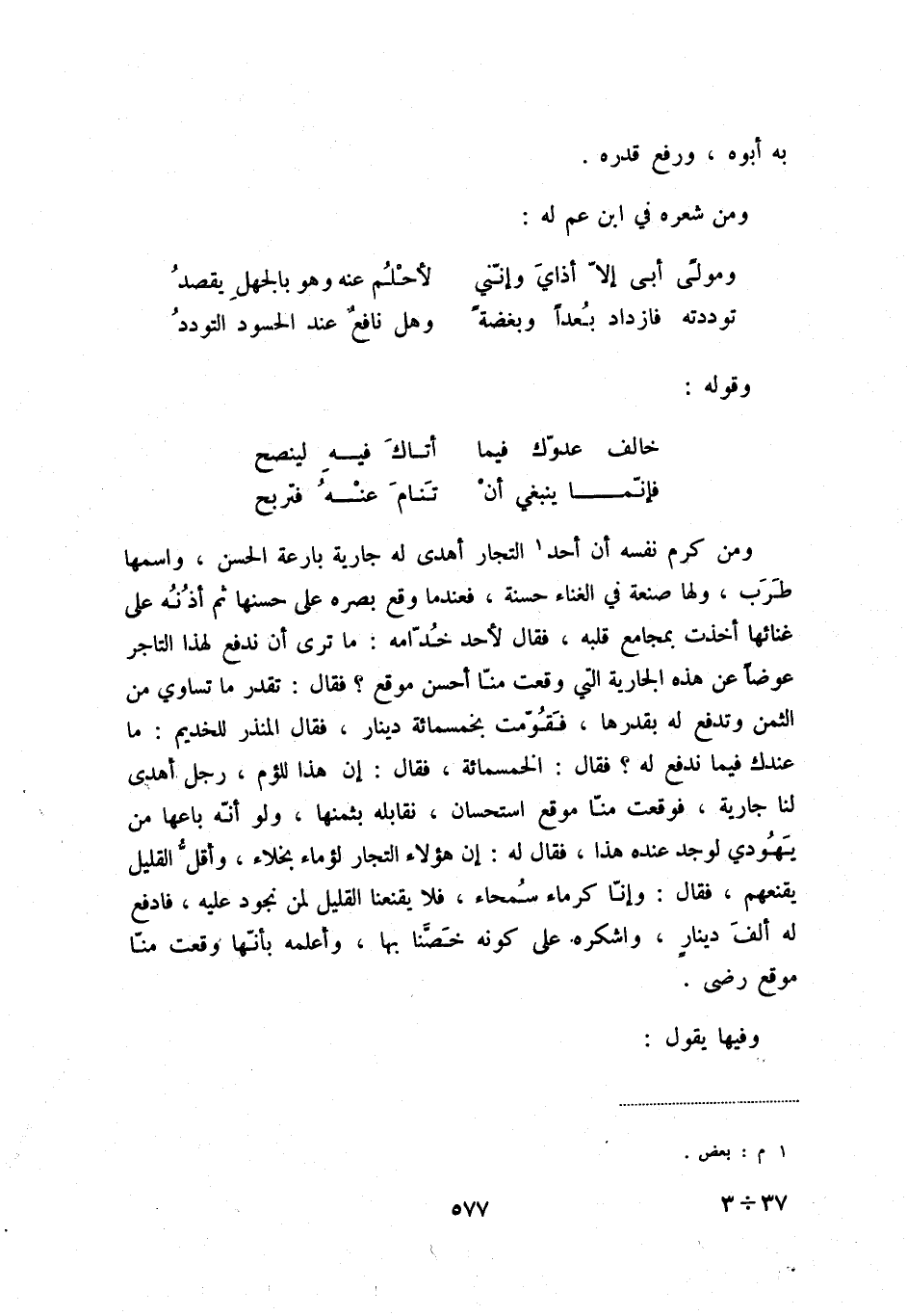 فإنما ينبغي أن ... تنام عنه فتربح ومن كرم نفسه أن أحد (1) التجار أهدى له جارية بارعة الحسن، واسمها طرب، ولها صنعة في الغناء حسنة، فعندما وقع بصره على حسنها ثم أذنه على غنائها أخذت بمجامع قلبه، فقال لأحد خدامه: ماترى أن ندفع لهذا التاجر عوضاً عن هذه الجارية التي وقعت منا أحسن موقع فقال: تقدر ما تساوي من الثمن وتدفع له بقدرها، فقومت بخمسمائة دينار، فقال المنذر للخديم: ما عندك فيما ندفع له فقال: الخمسمائة، فقال: إن هذا للؤم، رجل أهدى لنا جارية، فوقعت منا موقع استحسان، نقابله بثمنها، ولو أنه باعها من يهودي لوجد عنده هذا، فقال له: إن هؤلاء التجار لؤماء بخلاء، وأقل القليل يقنعهم، فقال: وإنا كرماء سمحاء، فلا يقنعنا القليل لمن نجود عليه، فادفع له ألف دينارٍ، واشكره على كونه خصنا بها، وأعلمه بأنها وقعت منا موقع رضى.