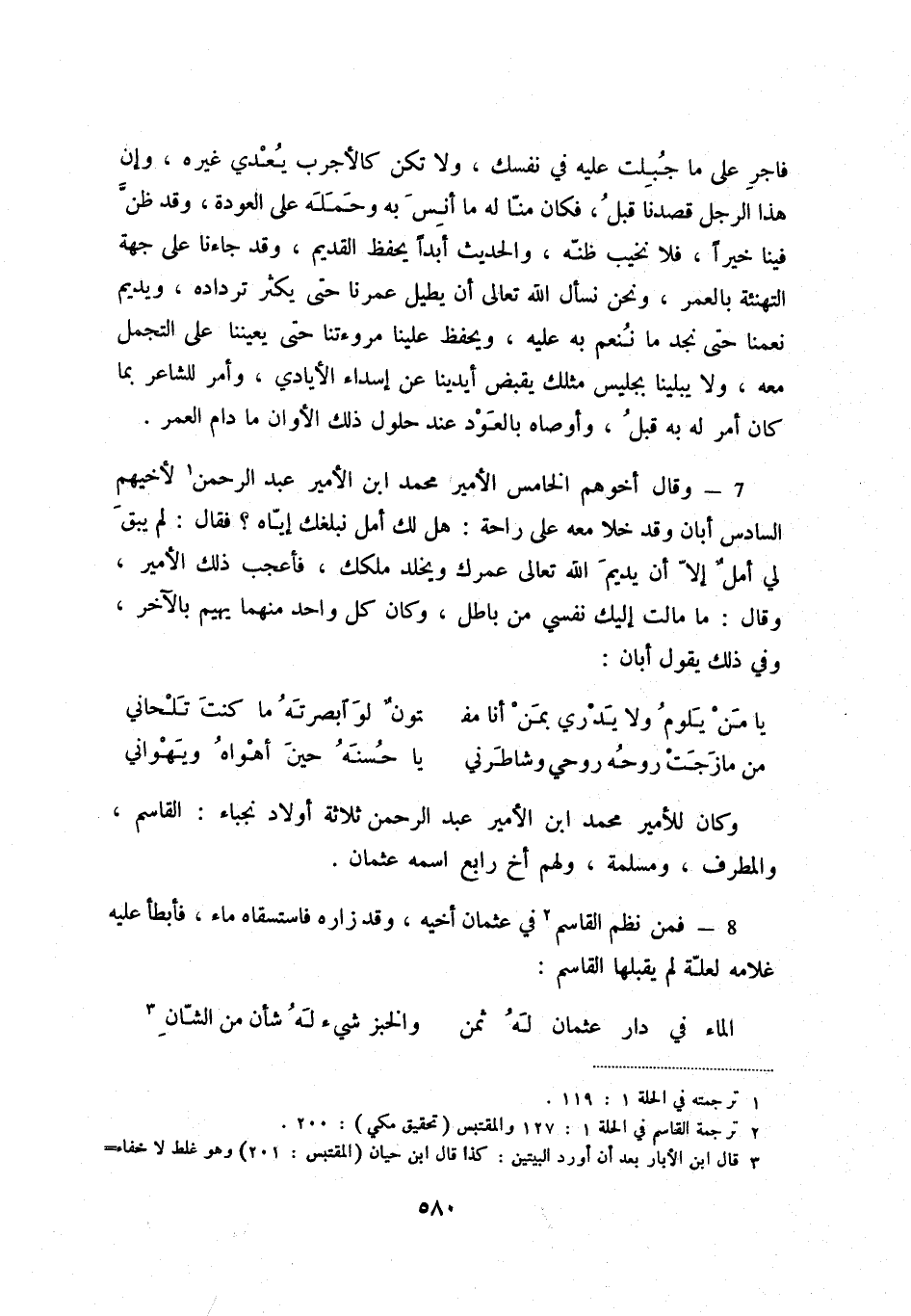7 - وقال أخوهم الخامس الأمير محمد ابن الأمير عبد الرحمن (1) لأخيهم السادس أبان وقد خلا معه على راحة: هل لك أمل نبلغك إياه فقال: لم يبق لي أملٌ إلاّ أن يديم الله تعالى عمرك ويخلد ملكك، فأعجب ذلك الأمير، وقال: ما مالت إليك نفسي من باطل، وكان واحد منهما يهيم بالآخر، وفي ذلك يقول أبان: