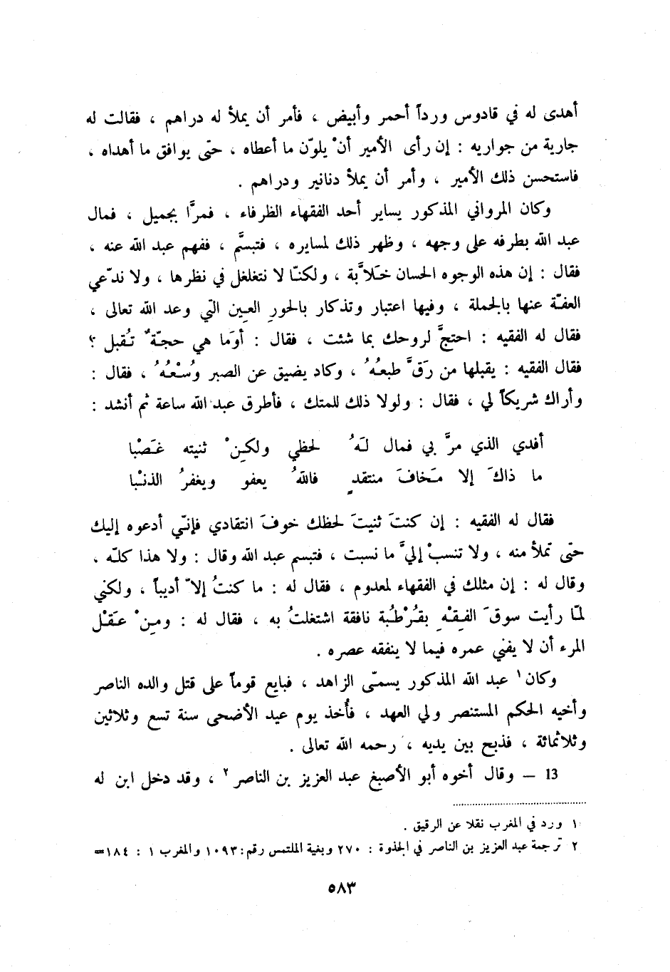 (2) ترجمة عبد العزيز بن الناصر في الجذوة: 270 وبغية الملتمس رقم: 1093 والمغرب 1: 184 والحلة 1: 208 وأبياته الأولى في المصادر السابقة ما عدا المغرب والقطعة الثانية في المغرب وحده.