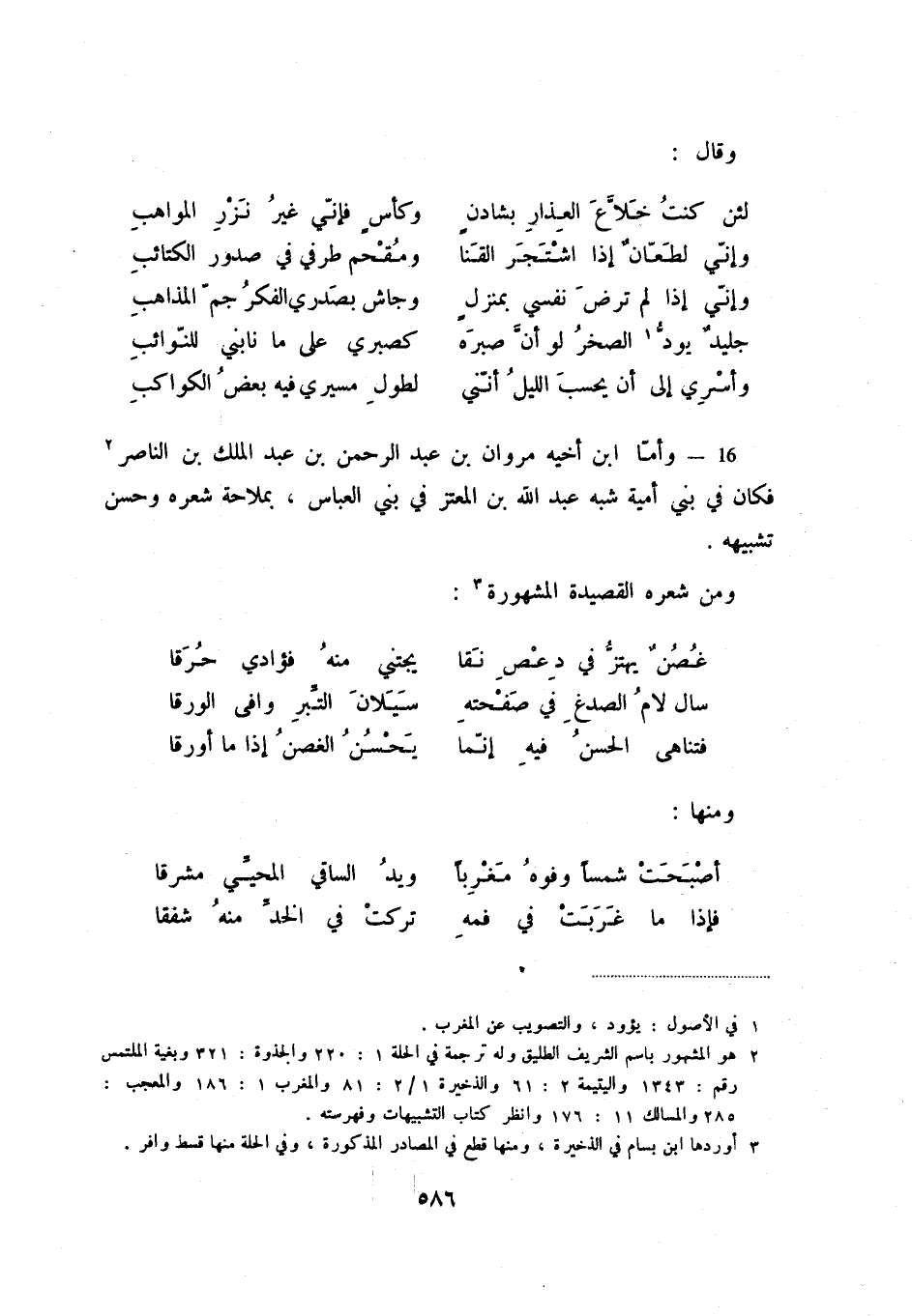 وأسري إلى أن يحسب الليل أنّني ... لطول مسيري فيه بعض الكواكب 16 - وأما ابن أخيه مروان بن عبد الرحمن بن عبد الملك بن الناصر (2) فكان في بني أمية شبه عبد الله بن المعتز في بني العباس، بملاحة شعره وحسن تشبيهه.