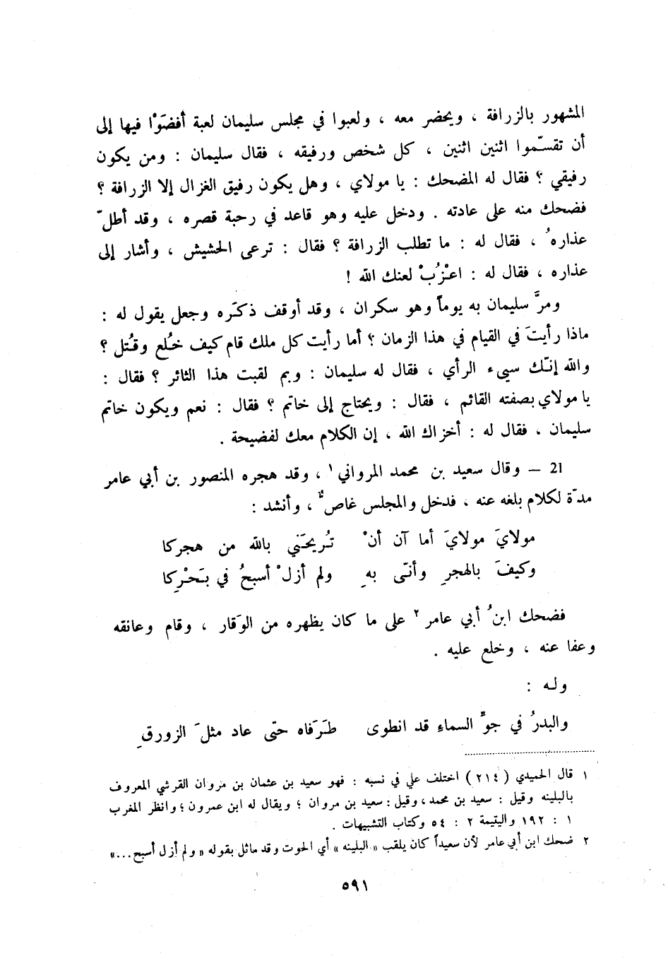 21 - وقال سعيد بن محمد المرواني (1) ، وقد هجره المنصور بن أبي عامر مدة لكلام بلغه عنه، فدخل المجلس غاصٌ، وأنشد: