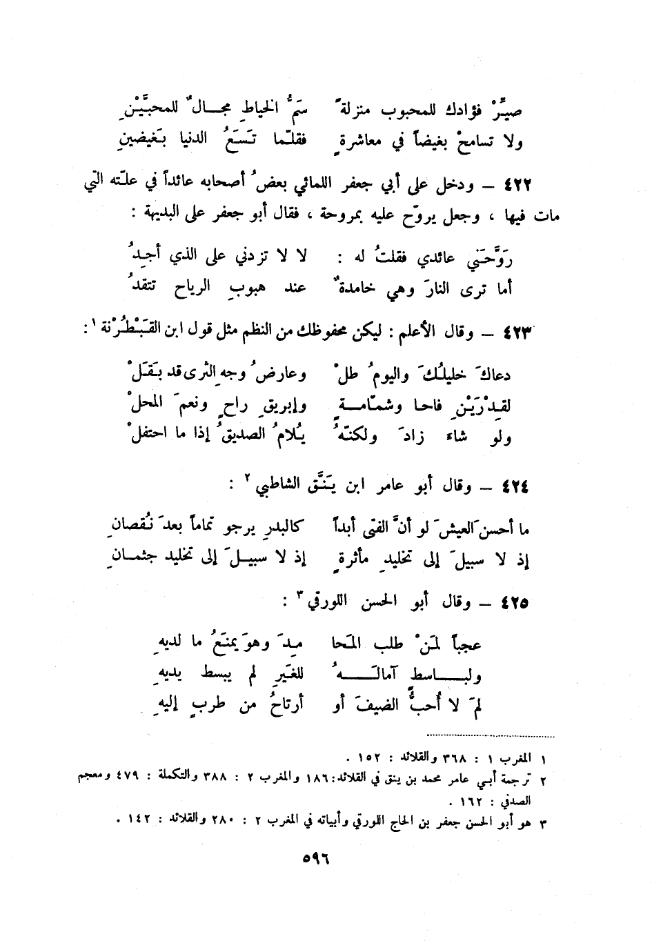 ولا تسامح بغيضاً في معاشرةٍ ... فقلّما تسع الدنيا بغيضين 422 - ودخل على أبي جعفر اللمائي بعض أصحابه عائداً في علته التي مات فيها، وجعل يروح عليه بمروحة، فقال أبو جعفر على البديهة: