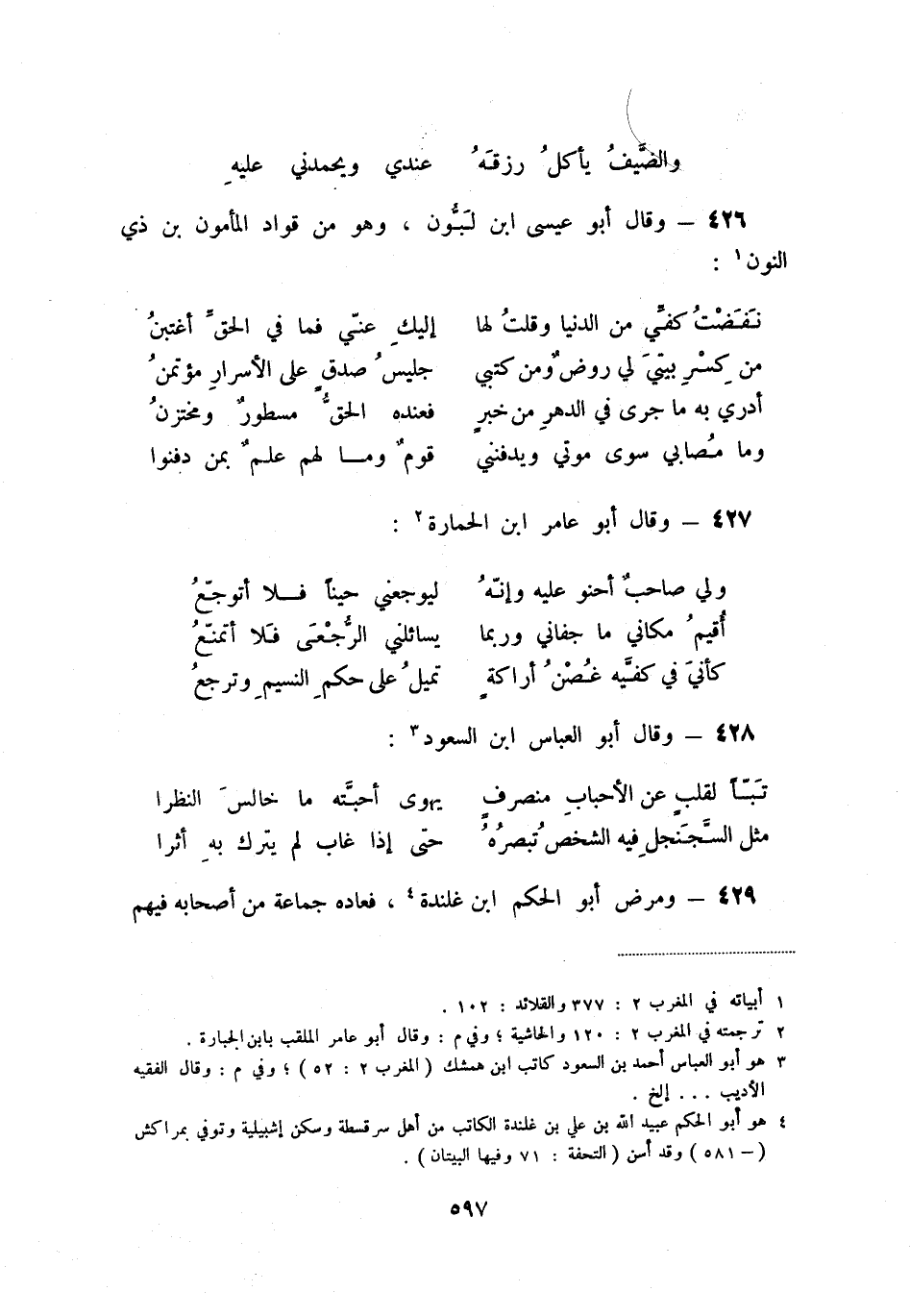 والضّيف يأكل رزقه ... عندي ويحمدني عليه 426 - وقال أبو عيسى ابن لبون، وهو من قواد المأمون بن ذي النون (1) :