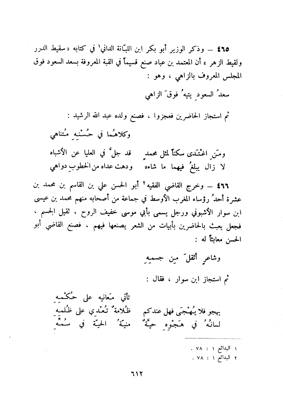 465 - وذكر الوزير أبو بكر ابن اللبانة الداني (1) في كتابه " سقيط الدرر ولقيط الزهر " أن المعتمد بن عباد صنع قسيماً في القبة المعروفة بسعد السعود فوق المجلس المعروف بالزاهي، وهو: