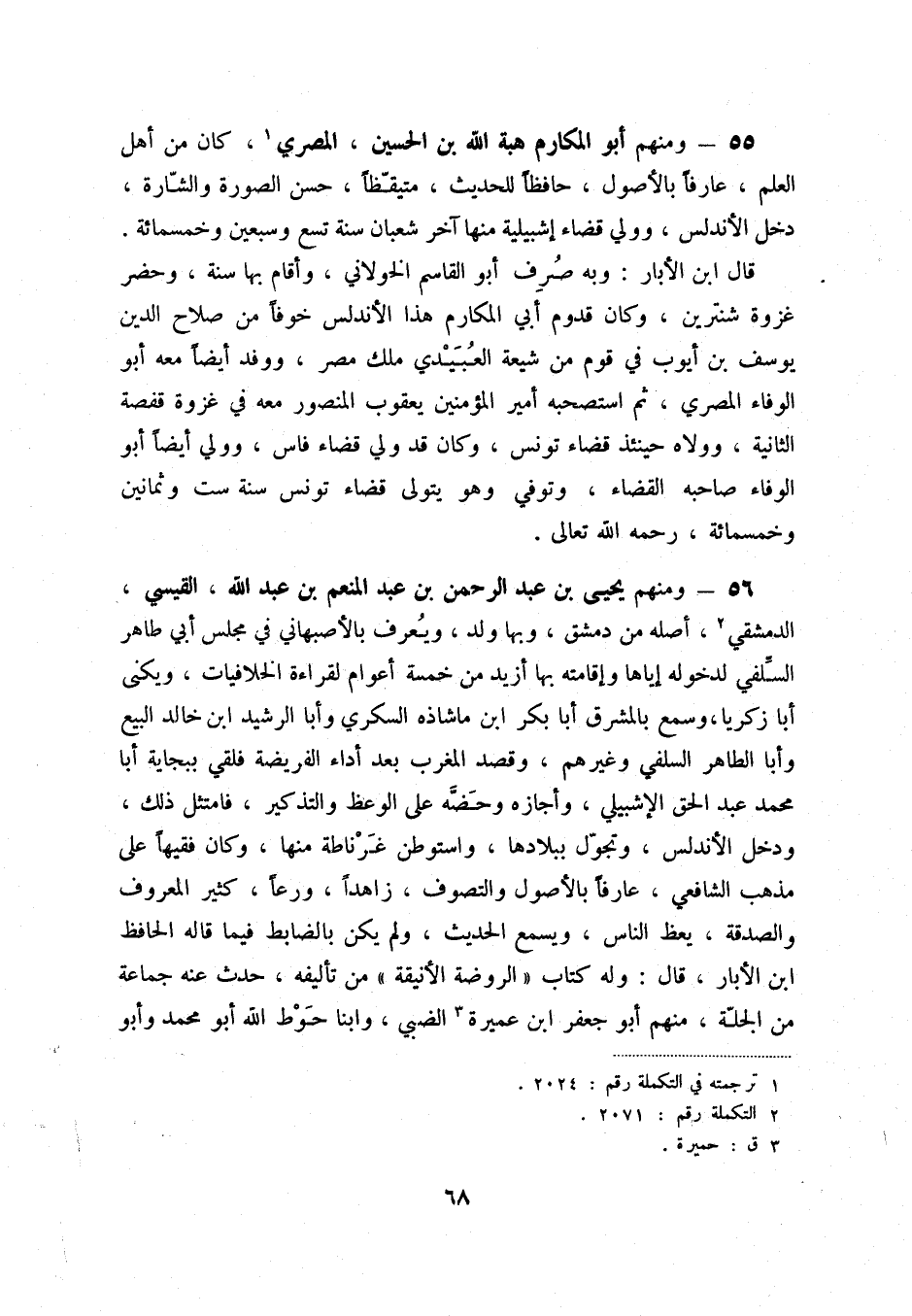 55 - ومنهم أبو المكارم هبة الله بن الحسين، المصري (1) ، كان من أهل العلم، عارفاً بالأصول، حافظاً للحديث، متيقظاً، حسن الصورة والشارة، دخل الأندلس، وولي قضاء إشبيلية منها آخر شعبان سنة تسع وسبعين وخمسمائة. قال ابن الأبار: وبه صرف أبو القاسم الخولاني، وأقام بها سنة، وحضر غزوة شنترين، وكان قدوم أبي المكارم هذا الأندلس خوفاً من صلاح الدين يوسف بن أيوب في قوم من شيعة العبيدي ملك مصر، ووفد أيضاً معه أبو الوفاء المصري، ثم استصحبه أمير المؤمنين يعقوب المنصور معه في غزوة قفصة الثانية، وولاه حينئذ قضاء تونس، وكان قد ولي قضاء فاس، وولي أيضاً أبو الوفاء صاحبه القضاء، وتوفي وهو يتولى قضاء تونس سنة ست وثمانين وخمسمائة، رحمه الله تعالى.