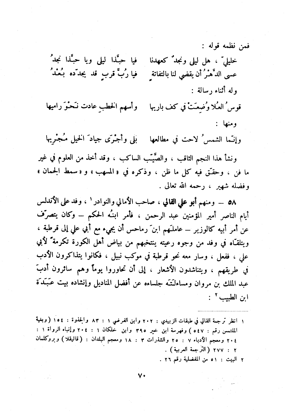 58 - ومنهم أبو علي القالي، صاحب الأمالي والنوادر (1) ، وفد على الأندلس أيام الناصر أمير المؤمنين عبد الرحمن، فأمر ابنه الحكم - وكان يتصرف عن أمر أبيه كالوزير - عاملهم ابن رماحس أن يجيء مع أبي علي إلى قرطبة، ويتلقاه قي وفد من وجوه رعيته ينتخبهم من بياض أهل الكورة تكرمةً لأبي علي، ففعل، وسار معه نحو قرطبة في موكب نبيل، فكانوا يتذاكرون الأدب في طريقهم، ويتناشدون الأشعار، إلى أن تحاوروا يوماً وهم سائرون أدب عبد الملك بن مروان ومساءلته جلساءه عن أفضل المناديل وإنشاده بيت عبدة ابن الطبيب (2) :