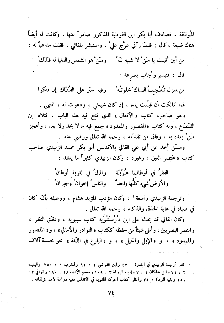(1) انظر ترجمة الزبيدي في الجذوة: 43 وابن الفرضي 2: 92 والمغرب 1: 250 واليتيمة 2: 71 وابن خلكان 4: 7 وإنباه الرواة 3: 109 ومعجم الأدباء 18: 180 والوافي 2: 251 وبغية الوعاة: 34 وانظر كتاب الحركة اللغوية في الأندلس ففيه دراسة لأهم مؤلفاته.