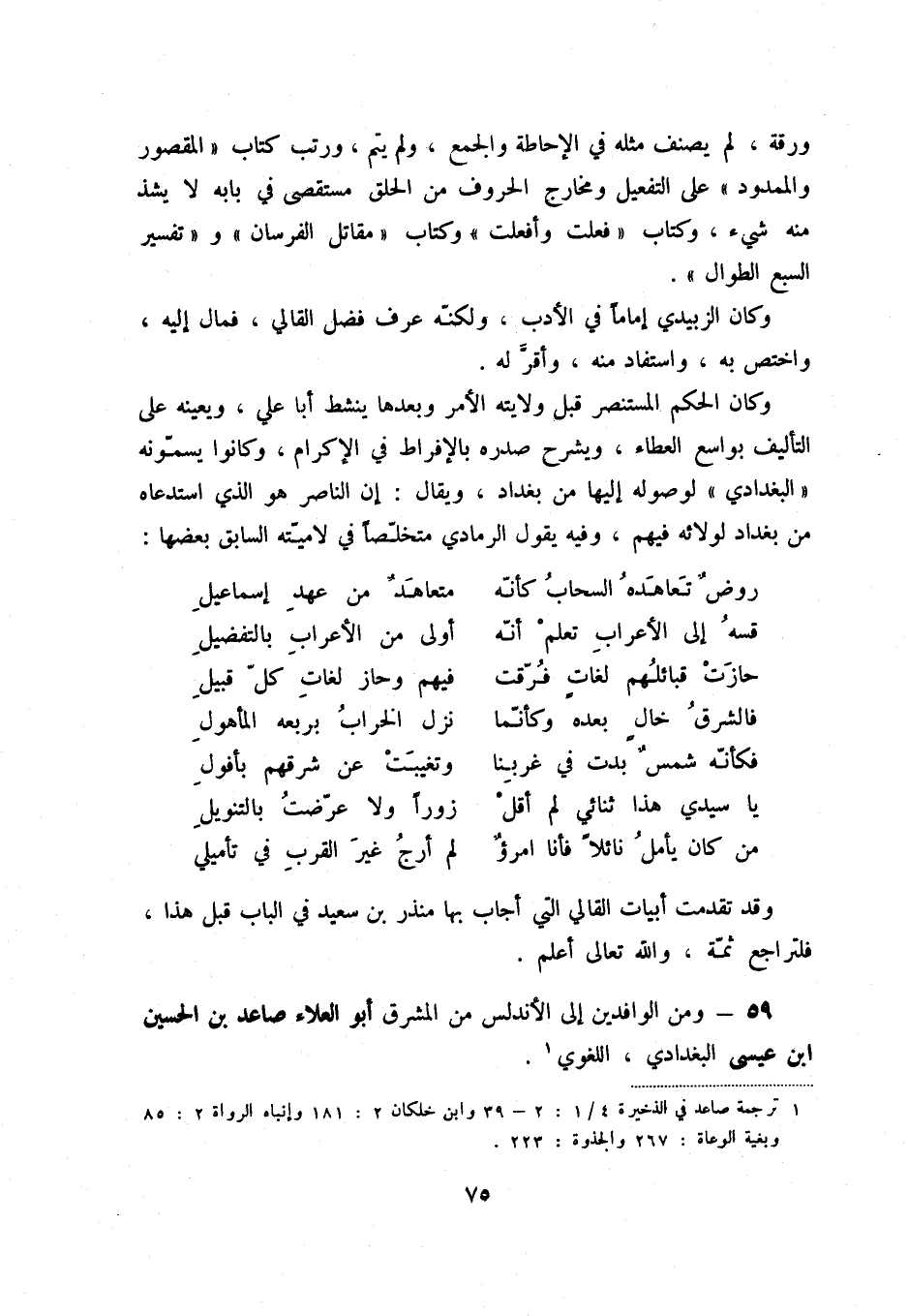59 - ومن الوافدين إلى الأندلس من المشرق أبو العلاء صاعد بن الحسين ابن عيسى البغدادي، اللغوي (1) .