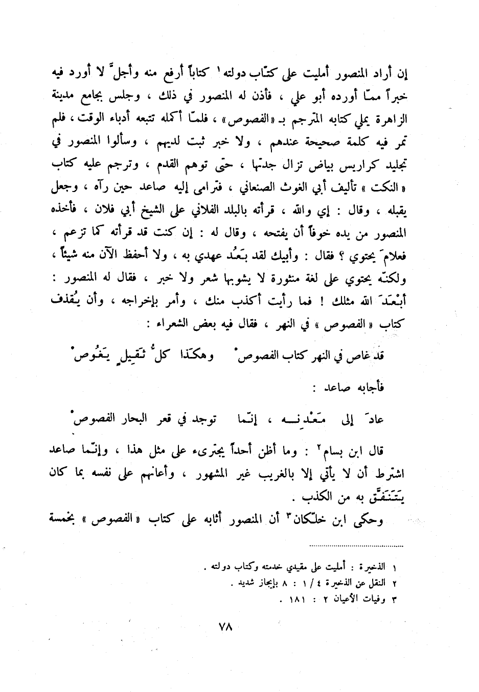 وحكى ابن خلكان (3) أن المنصور أثابه على كتاب " الفصوص " بخمسة
