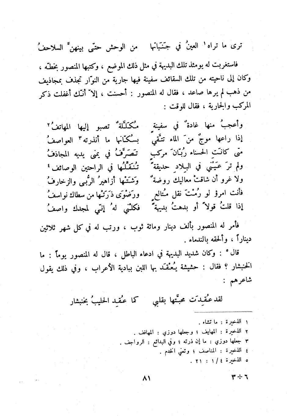 ترى ماتراه (1) العين في جنباتها ... من الوحش حتّى بينهنّ السلاحف فاستغربت له يومئذٍ تلك البديهة في مثل ذلك الموضع، وكتبها المنصور بخطه، وكان إلى ناحيته من تلك السقائف سفينة فيها جارية من النوار تجدف بمجاديف من ذهب لم يرها صاعد، فقال له المنصور: أحسنت، إلا أنك أغفلت ذكر المركب والجارية، فقال للوقت: