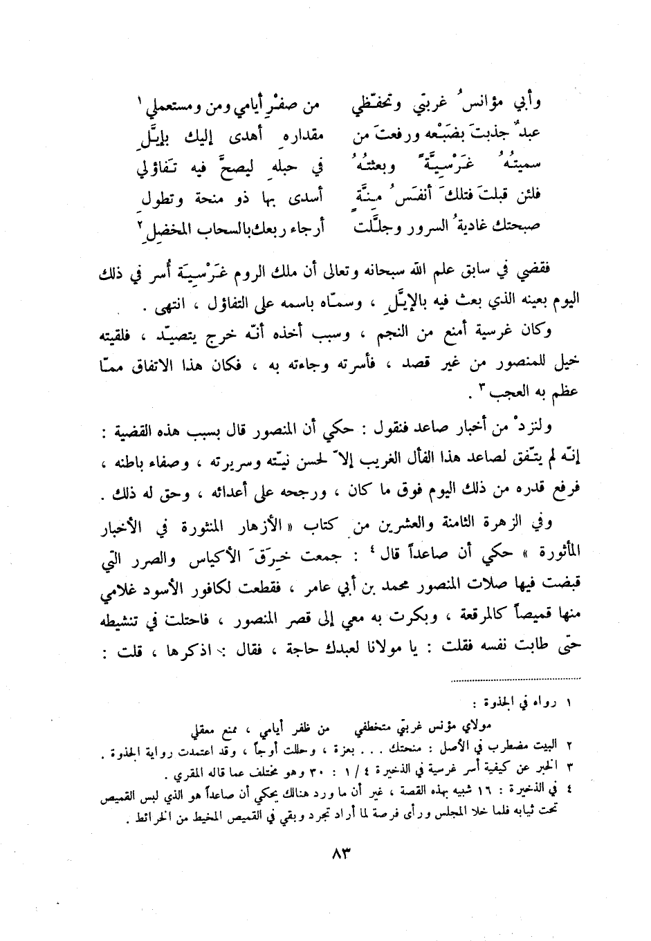 صبحتك غادية السرور وجلّلت ... أرجاء ربعك بالسحاب المخضل (2) فقضي قي سابق علم الله سبحانه وتعالى أن ملك الروم غرسية أسر في ذلك اليوم الذي بعث فيه بالإيل، وسماه باسمه على التفاؤل، انتهى.