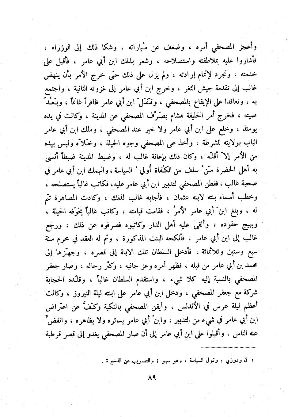 وأعجز المصحفي أمره، وضعف عن مباراته، وشكا ذلك إلى الوزراء، فأشاروا عليه بملاطفته واستصلاحه، وشعر بذلك ابن أبي عامر، فأقبل على خدمته، وتجرد لإتمام إرادته، ولم يزل على ذلك حتى خرج الأمر بأن ينهض غالب إلى تقدمة جيش الثغر، وخرج ابن أبي عامر إلى غزوته الثانية، واجتمع به، وتعاقدا على الإيقاع بالمصحفي، وقفل ابن أبي عامر ظافراً غانماً، وبعد صيته، فخرج أمر الخليفة هشام بصرف المصحفي عن المدينة، وكانت في يده يومئذ، وخلع على ابن أبي عامر ولا خبر عند المصحفي، وملك ابن أبي عامر الباب بولايته للشرطة، وأخذ على المصحفي وجوه الحيلة، وخلاه وليس بيده من الأمر إلا أقله، وكان ذلك بإعانة غالب له، وضبط المدينة ضبطاً أنسى به أهل الحضرة من سلف من الكفاة أولي (1) السياسة، وانهمك ابن أبي عامر في صحبة غالب، ففطن المصحفي لتدبير ابن أبي عامر عليه، فكاتب غالباً يستصلحه، وخطب أسماء بنته لابنه عثمان، فأجابه غالب لذلك، وكادت المصاهرة تتم له، وبلغ ابن أبي عامر الأمر، فقامت قيامته، وكاتب غالباً يخوفه الحيلة، ويهيج حقوده، وألقى عليه أهل الدار وكاتبوه فصرفوه عن ذلك، ورجع غالب إلى ابن أبي عامر، فأنكحه البنت المذكورة، وتم له العقد في محرم سنة سبع وستين وثلاثمائة، فأدخل السلطان تلك الابنة إلى قصره، وجهزها إلى محمد بن أبي عامر من قبله، فطهر أمره وعز جانبه، وكثر رجاله، وصار جعفر المصحفي بالنسبة إليه كلا شيء، واستقدم السلطان غالباً، وقلده الحجابة شركة مع جعفر المصحفي، ودخل ابن أبي عامر على ابنته ليلة النيروز، وكانت أعظم ليلة عرس في الأندلس، وأيقن المصحفي بالنكبة وكف عن اعتراض ابن أبي عامر في شيء من التدبير، وابن أبي عامر يساتره ولا يظاهره، وانفض عنه الناس، وأقبلوا على ابن أبي عامر إلى أن صار المصحفي يغدو إلى قصر قرطبة