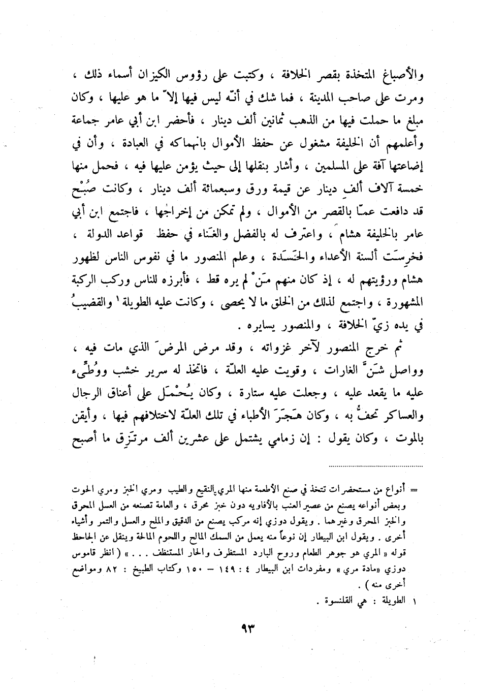 والأصباغ المتخذة بقصر الخلافة، وكتبت على رؤوس الكيزان أسماء ذلك، ومرت على صاحب المدينة، فما شك في أنه ليس إلا ما هو عليها، وكان مبلغ ما حملت فيها من الذهب ثمانين ألف دينار، فأحضر ابن أبي عامر جماعة أعلمهم أن الخليفة مشغول عن حفظ الأموال بانهماكه في العبادة، وأن في إضاعتها آفة على المسلمين، وأشار بنقلها إلى حيث يؤمن عليها فيه، فحمل منها خمسة آلاف ألف دينار عن قيمة ورق وسبعمائة ألف دينار، وكانت صبح قد دافعت عما بالقصر من الأموال، ولم تمكن من إخراجها، فاجتمع ابن أبي عامر بالخليفة هشام، واعترف له بالفضل والغناء في حفظ قواعد الدولة، فخرست ألسنة الأعداء والحسدة، وعلم المنصور ما في نفوس الناس لظهور هشام ورؤيتهم له، إذ كان منهم من لم يره قط، فأبرزه للناس وركب الركبة المشهورة، واجتمع لذلك من الخلق ما لا يحصى، وكانت عليه الطويلة (1) والقضيب في يده زي الخلاقة، والمنصور يسايره.