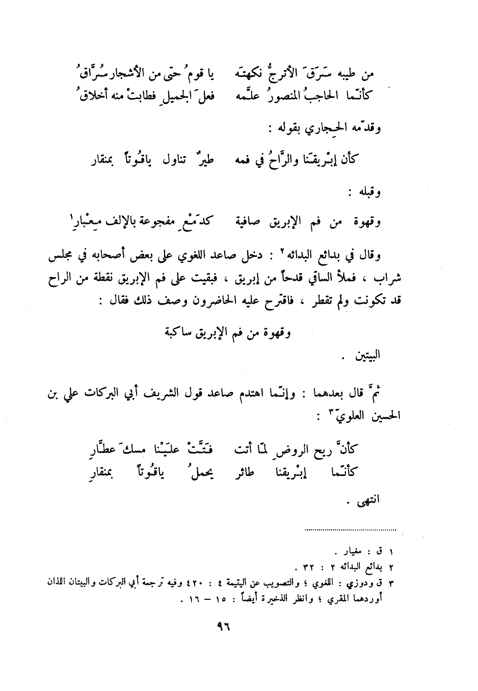 وقهوة من فم الإبريق صافية ... كدمع مفجوعة بالإلف معبار (1) وقال في بدائع البدائه (2) : دخل صاعد اللغوي على بعض أصحابه في مجلس شراب، فملأ الساقي قدحاً من إبريق، فبقيت على فم الإبريق نقطة من الراح قد تكونت ولم تقطر، فاقترح عليه الحاضرون وصف ذلك فقال: