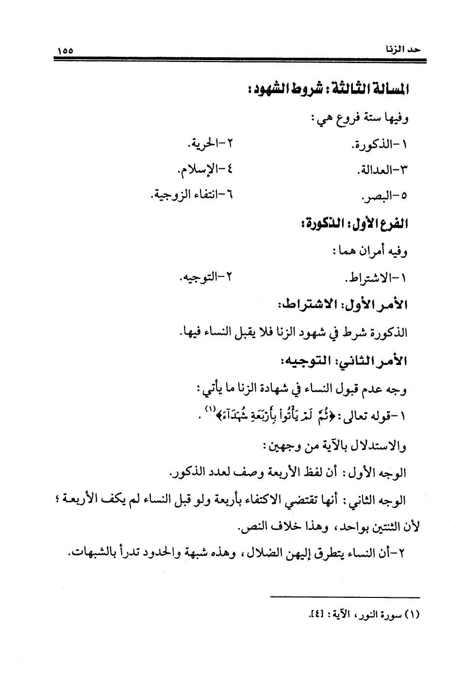 الذكورة شرط في شهود الزنا فلا يقبل النساء فيها.