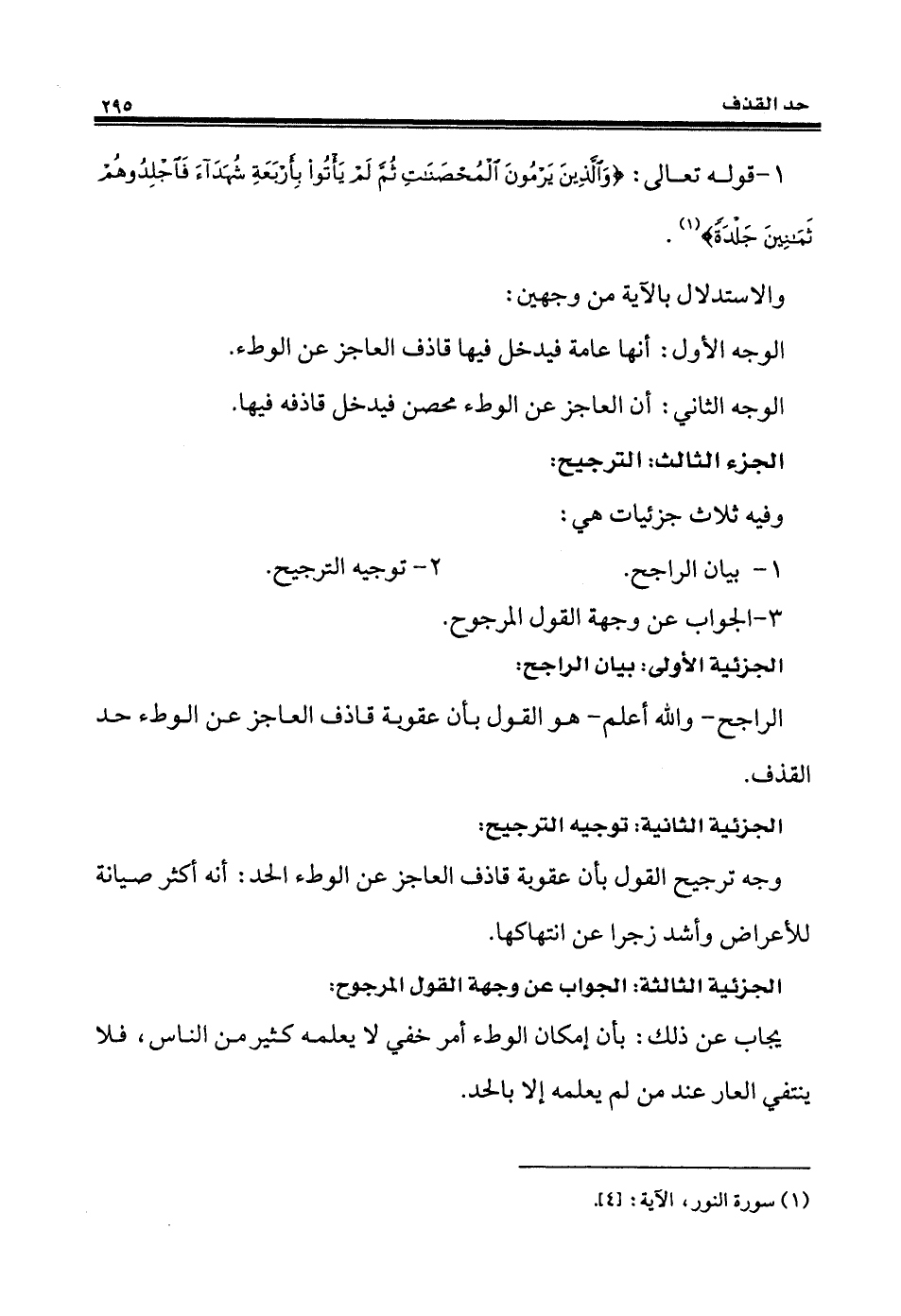 وجه ترجيح القول بأن عقوبة قاذف العاجز عن الوطء الحد: أنه أكثر صيانة للأعراض وأشد زجرا عن انتهاكها.