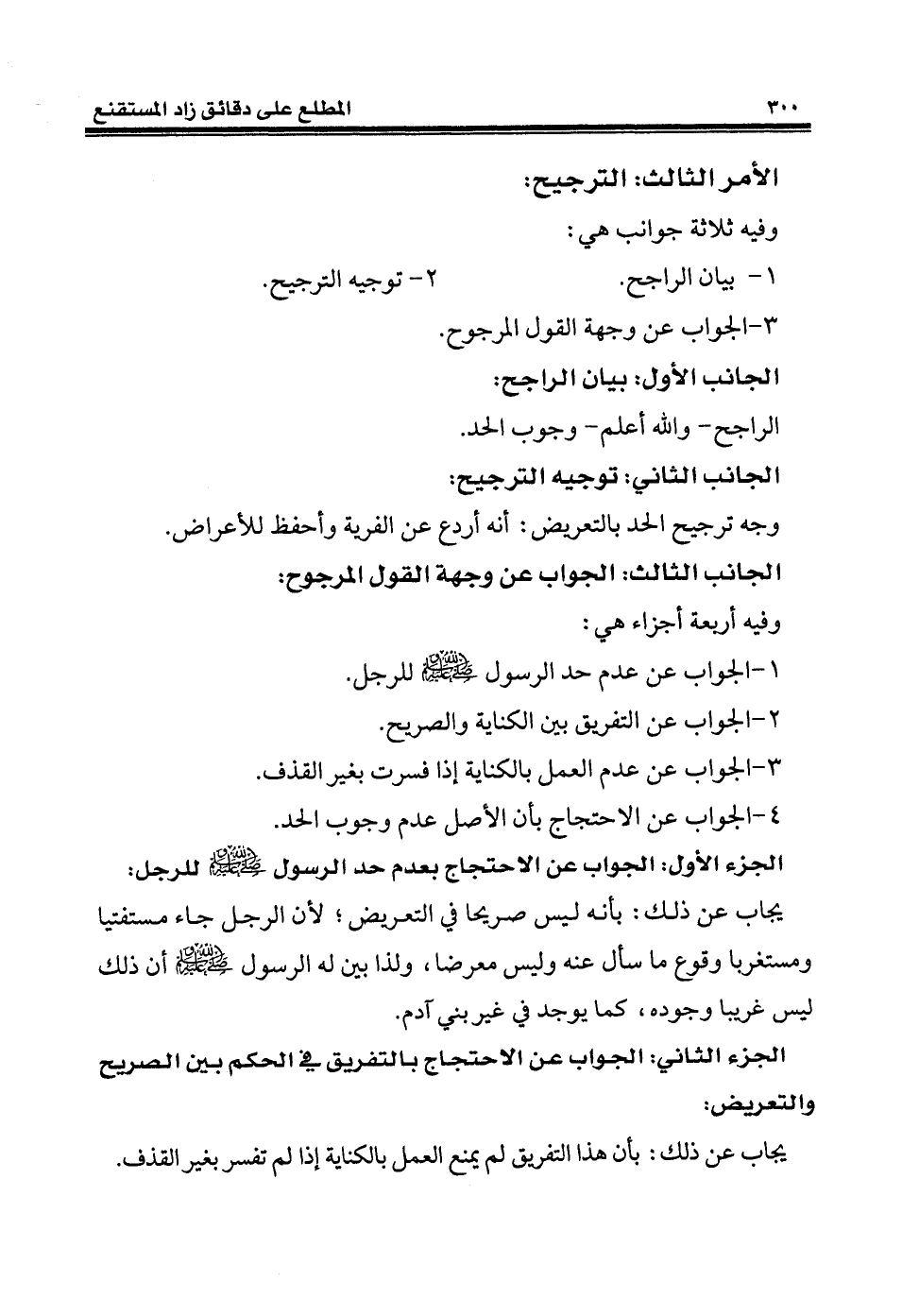 الجزء الأول: الجواب عن الاحتجاج بعدم حد الرسول - صلى الله عليه وسلم - للرجل: يجاب عن ذلك: بأنه ليس صريحا في التعريض؛ لأن الرجل جاء مستفتيا ومستغربا وقوع ما سأل عنه وليس معرضا، ولذا بين له الرسول - صلى الله عليه وسلم - أن ذلك ليس غريبا وجوده، كما يوجد في غير بني آدم.