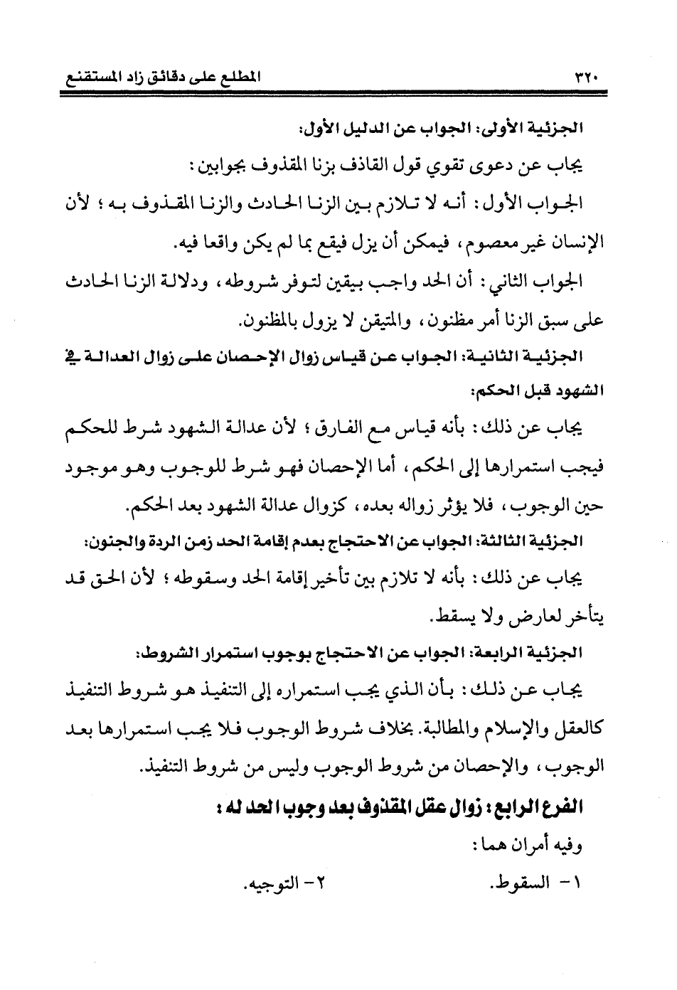 يجاب عن ذلك: بأن الذي يجب استمراره إلى التنفيذ هو شروط التنفيذ كالعقل والإسلام والمطالبة. بخلاف شروط الوجوب فلا يجب استمرارها بعد الوجوب، والإحصان من شروط الوجوب وليس من شروط التنفيذ.