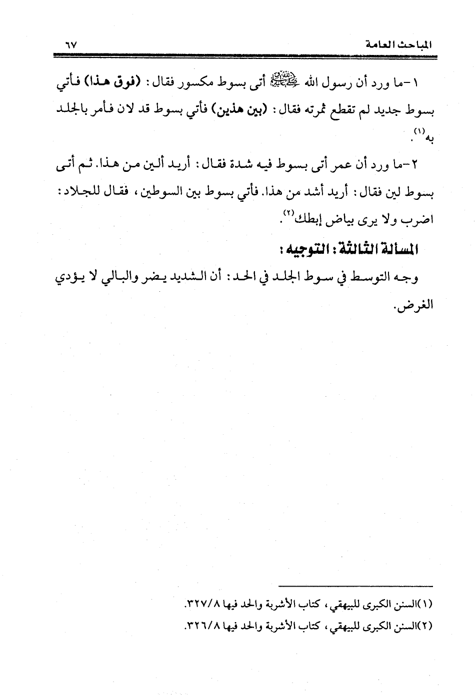 1 - ما ورد أن رسول الله - صلى الله عليه وسلم - أتى بسوط مكسور فقال: (فوق هذا) فأتي بسوط جديد لم تقطع ثمرته فقال: (بين هذين) فأتي بسوط قد لان فأمر بالجلد به (¬1).