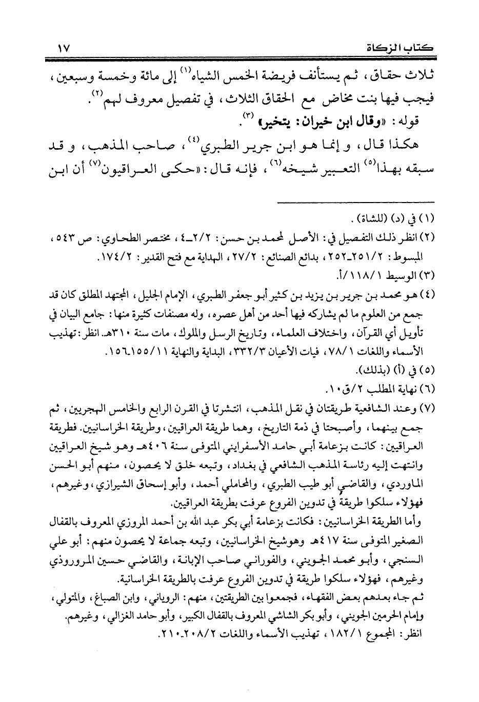 (¬7) وعند الشافعية طريقتان في نقل المذهب، انتشرتا في القرن الرابع والخامس الهجريين، ثم جمع بينهما، وأصبحتا في ذمة التاريخ، وهما طريقة العراقيين، وطريقة الخراسانيين. فطريقة العراقيين: كانت بزعامة أبي حامد الأسفرايني المتوفى سنة 406 هـ وهو شيخ العراقيين وانتهت إليه رئاسة المذهب الشافعي في بغداد، وتبعه خلق لا يحصون، منهم أبو الحسن الماوردي، والقاضي أبو طيب الطبري، والمحاملي أحمد، وأبو إسحاق الشيرازي، وغيرهم، فهؤلاء سلكوا طريقة في تدوين الفروع عرفت بطريقة العراقيين.