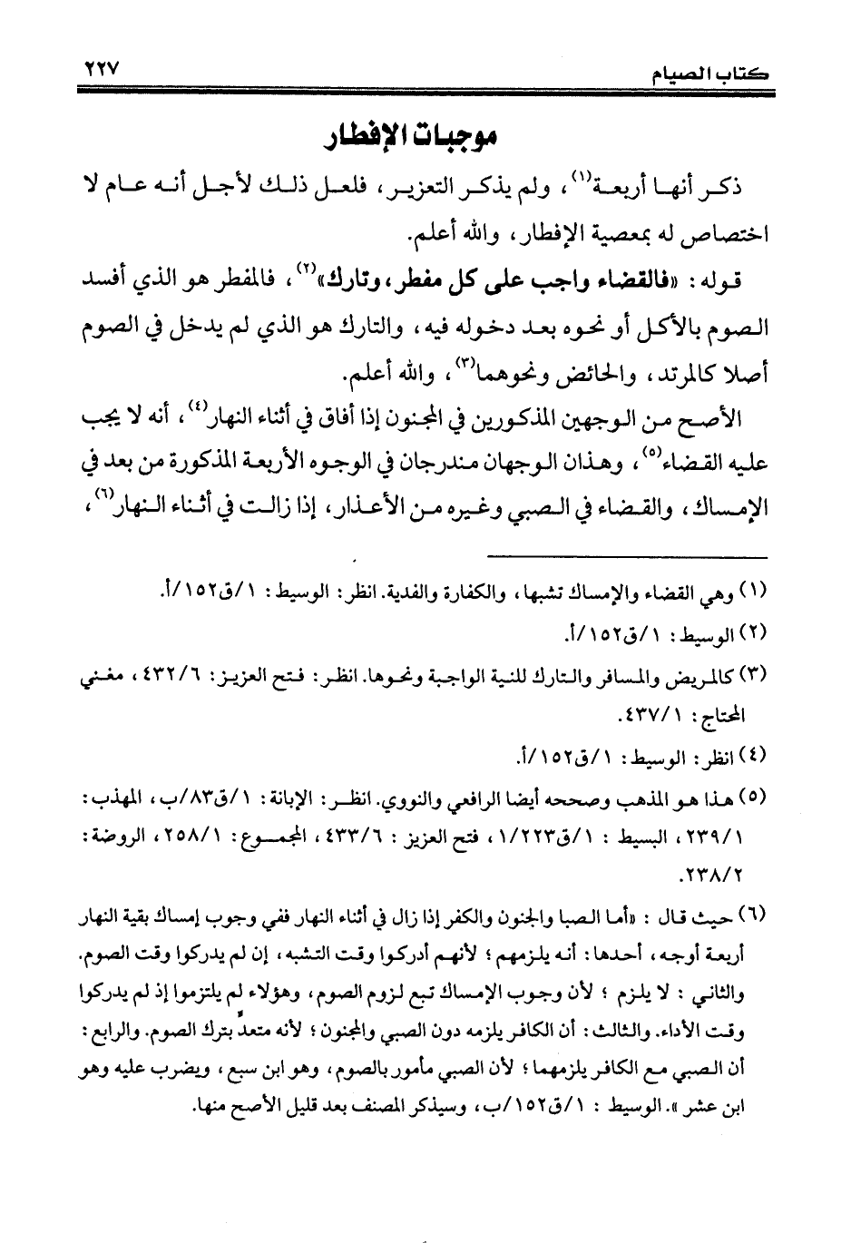 (¬6) حيث قال: "أما الصبا والجنون والكفر إذا زال في أثناء النهار ففي وجوب إمساك بقية النهار أربعة أوجه، أحدها: أنه يلزمهم؛ لأنهم أدركوا وقت التشبه، إن لم يدركوا وقت الصوم. والثاني: لا يلزم؛ لأن وجوب الإمساك تبع لزوم الصوم، وهؤلاء لم يلتزموا إذ لم يدركوا وقت الأداء. والثالث: أن الكافر يلزمه دون الصبي والمجنون؛ لأنه متعدٍّ بترك الصوم. والرابع: أن الصبي مع الكافر يلزمهما؛ لأن الصبي مأمور بالصوم، وهو ابن سبع، ويضرب عليه وهو ابن عشر". الوسيط: 1/ ق 152/ ب، وسيذكر المصنف بعد قليل الأصح منها.