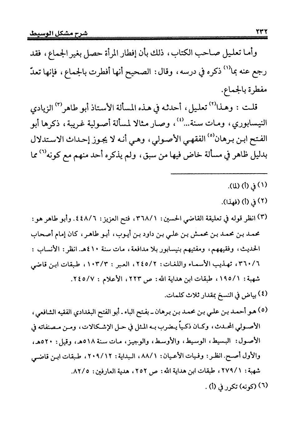 قلت: وهذا (¬2) تعليل، أحدثه في هذه المسألة الأستاذ أبو طاهر (¬3) الزيادي النيسابوري، ومات سنة ... (¬4)، وصار مثالا لمسألة أصولية غريبة، ذكرها أبو الفتح ابن برهان (¬5) الفقهي الأصولي، وهي أنه لا يجوز إحداث الاستدلال بدليل ظاهر في مسألة خاض فيها من سبق، ولم يذكره أحد منهم مع كونه (¬6) مما