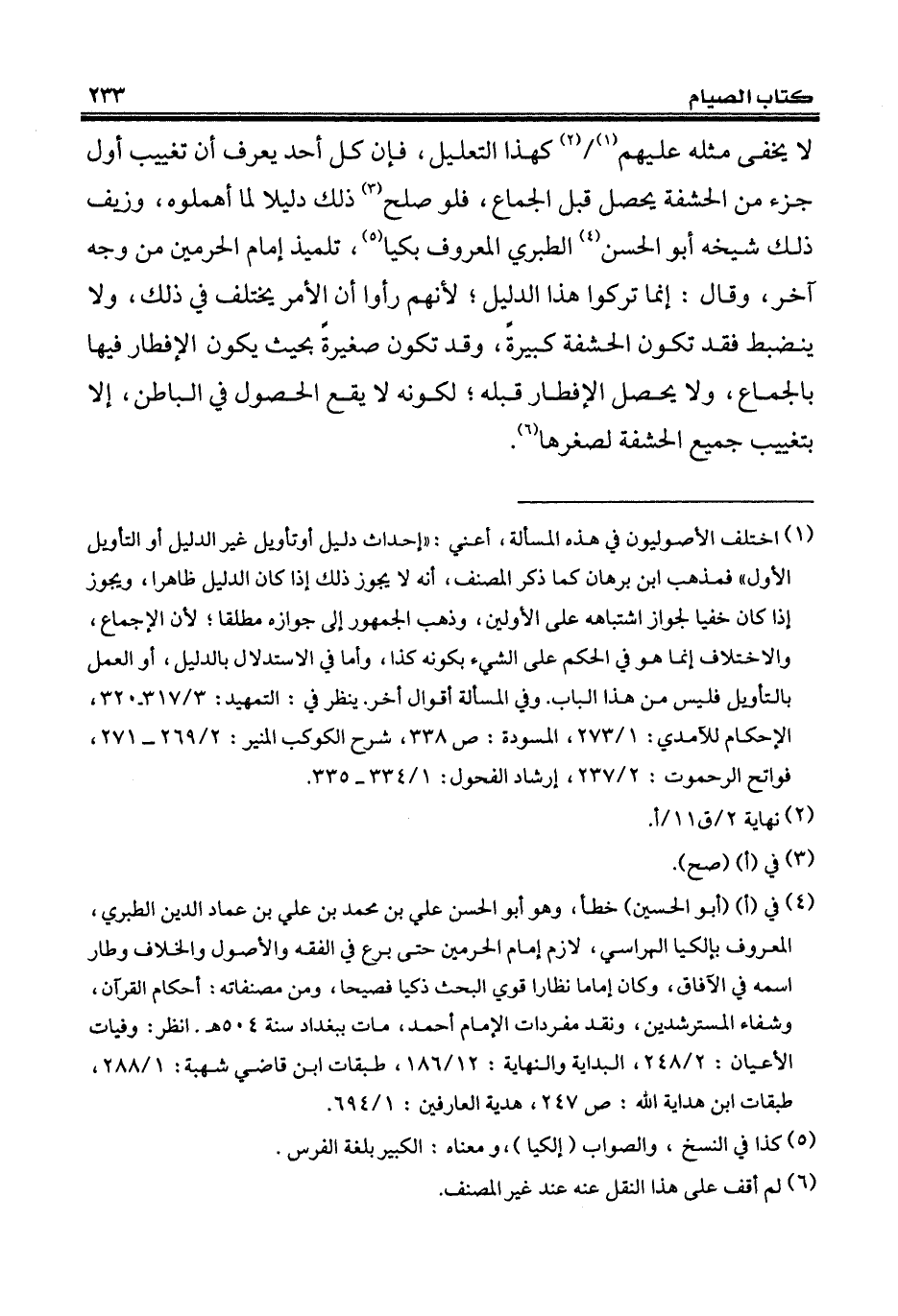 (¬4) في (أ) (أبو الحسين) خطأ، وهو أبو الحسن على بن محمَّد بن علي بن عماد الدين الطبري، المعروف بإلكيا الهراسي، لازم إمام الحرمين حتى برع في الفقه والأصول والخلاف وطار اسمه في الآفاق، وكان إماما نظارا قوي البحث ذكيا فصيحا، ومن مصفاته: أحكام القرآن، وشفاء المسترشدين، ونقد مفردات الإِمام أحمد، مات ببغداد سنة 504 هـ. انظر: وفيات الأعيان: 2/ 248، البداية والنهاية: 12/ 186، طبقات ابن قاضي شهبة: 1/ 288، طبقات ابن هداية الله: ص 247، هدية العارفين: 1/ 694.