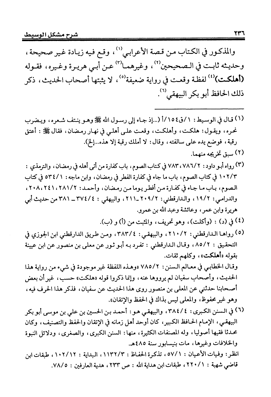 والمذكور في الكتاب من قصة الأعرابي (¬1)، وقع فيه زيادة غير صحيحة، وحديثه ثابت في الصحيحين (¬2)، وغيرهما (¬3) عن أبي هريرة وغيره، فقوله (أهلكت) (¬4) لفظة وقعت في رواية ضعيفة (¬5)، لا يثبتها أصحاب الحديث، ذكر ذلك الحافظ أبو بكر البيهقي (¬6).
