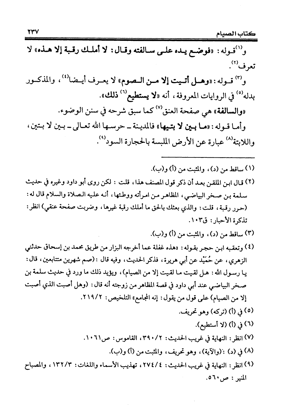 (¬4) وتعقبه ابن حجر بقوله: "هذه غفلة عما أخرجه البزار من طريق محمَّد بن إسحاق حدثني الزهري، عن حُمَيْد عن أبي هريرة، فذكر الحديث، وفيه قال: (صم شهرين متتابعين، قال: يا رسول الله: هل لقيت ما لقيت إلا من الصيام)، ويؤيد ذلك ما ورد في حديث سلمة بن صخر البياضي عند أبي داود في قصة المظاهر من زوجته أنه قال: (وهل أصبت الذي أصبت إلا من الصيام) على قول من يقول: إنه المجامع" التلخيص: 2/ 219.