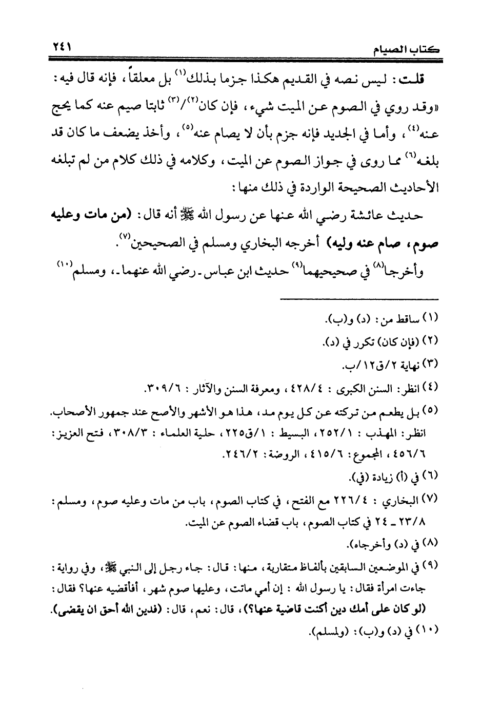 قلت: ليس نصه في القديم هكذا جزما بذلك (¬1) بل معلقاً، فإنه قال فيه: "وقد روي في الصوم عن الميت شيء، فإن كان (¬2) (¬3) ثابتا صيم عنه كما يحج عنه (¬4)، وأما في الجديد فإنه جزم بأن لا يصام عنه (¬5)، وأخذ يضعف ما كان قد بلغه (¬6) مما روى في جواز الصوم عن الميت، وكلامه في ذلك كلام من لم تبلغه الأحاديث الصحيحة الواردة في ذلك منها: