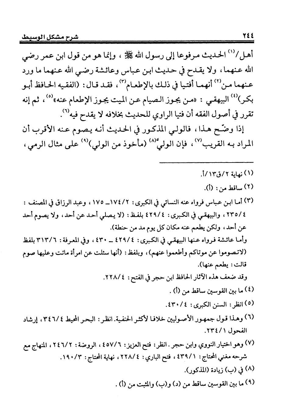 أهل (¬1) الحديث مرفوعاً إلى رسول الله - صلى الله عليه وسلم -، وإنما هو من قول ابن عمر رضي الله عنهما، ولا يقدح في حديث ابن عباس وعائشة رضي الله عنهما ما ورد عنهما من (¬2) أنهما أفتيا في ذلك بالإطعام (¬3)، فقد قال: (الفقيه الحافظ أبو بكر) (¬4) البيهقي: "من يجوز الصيام عن الميت يجوز الإطعام عنه" (¬5)، ثم إنه تقرر في أصول الفقه أن فتيا الراوي للحديث بخلافه لا يقدح فيه (¬6).