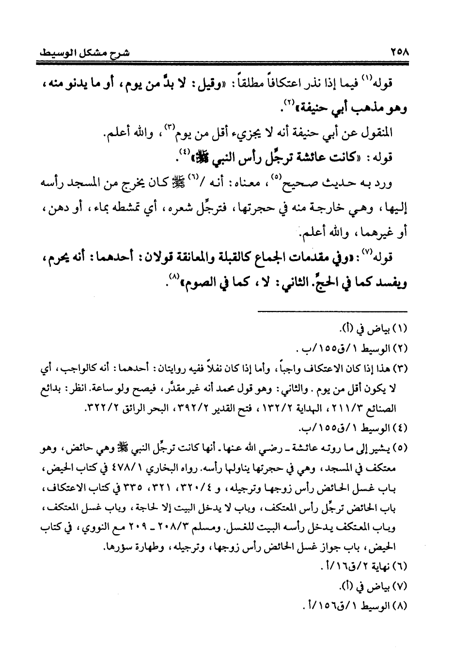(¬3) هذا إذا كان الاعتكاف واجباً، وأما إذا كان نفلاً ففيه روايتان: أحدهما: أنه كالواجب، أي لا يكون أقل من يوم. والثاني: وهو قول محمَّد أنه غير مقدَّر، فيصح ولو ساعة. انظر: بدائع الصنائع 3/ 211، الهداية 2/ 132، فتح القدير 2/ 392، البحر الرائق 2/ 322.