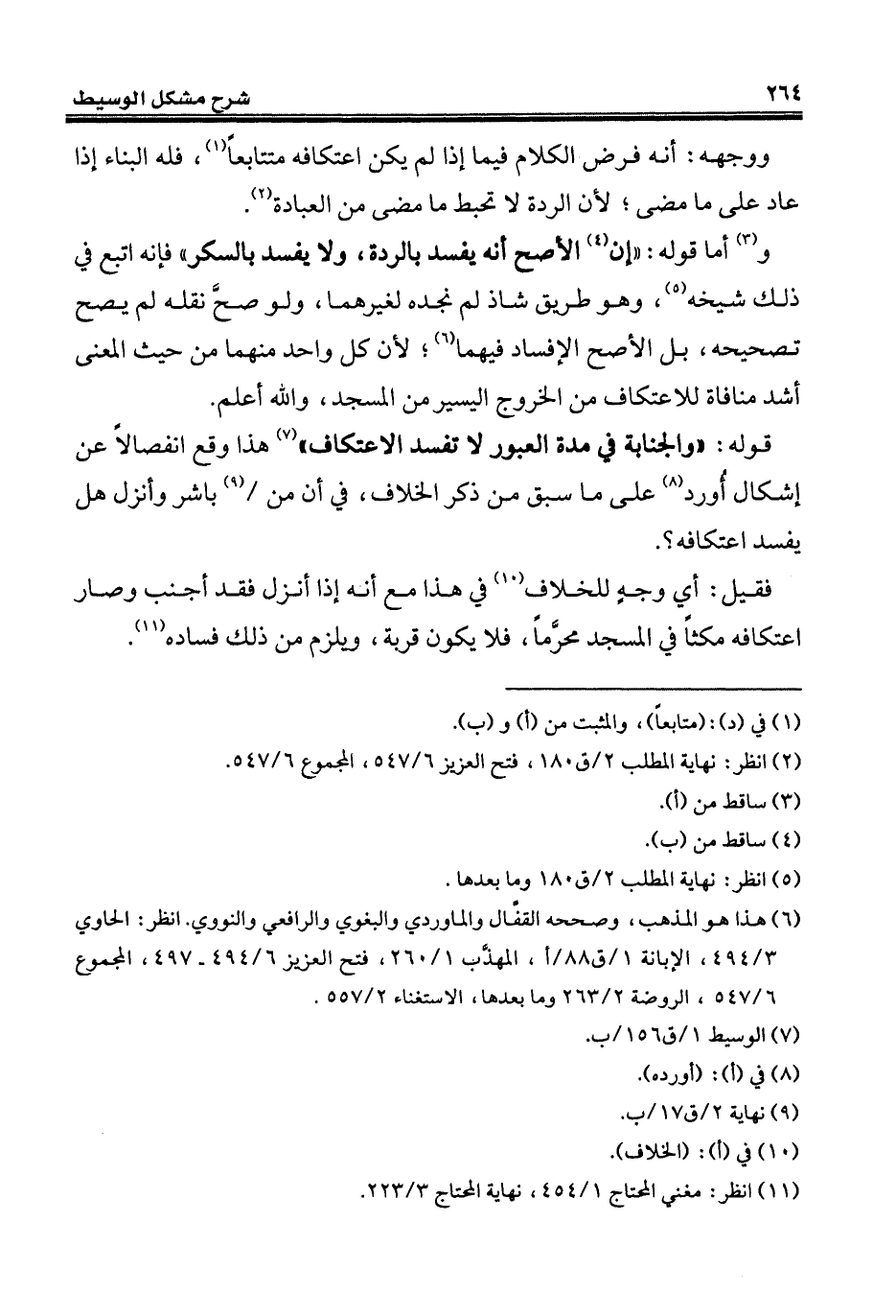قوله: "والجنابة في مدة العبور لا تفسد الاعتكاف" (¬7) هذا وقع انفصالاً عن إشكال أُورد (¬8) على ما سبق من ذكر الخلاف، في أن من (¬9) باشر وأنزل هل يفسد اعتكافه؟.