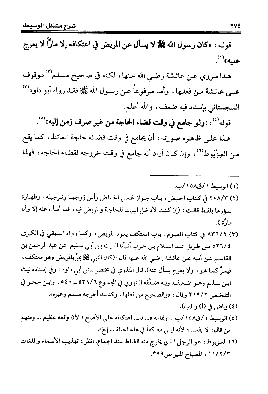 (¬5) الوسيط 1/ ق 158/ ب، وتمامه " ... فسد اعتكافه على الأصح؛ لأن وقعه عظيم ... ومنهم من قال: لا يفسد؛ لأنّه ليس معتكفاً في هذه الحالة ... إلخ".
