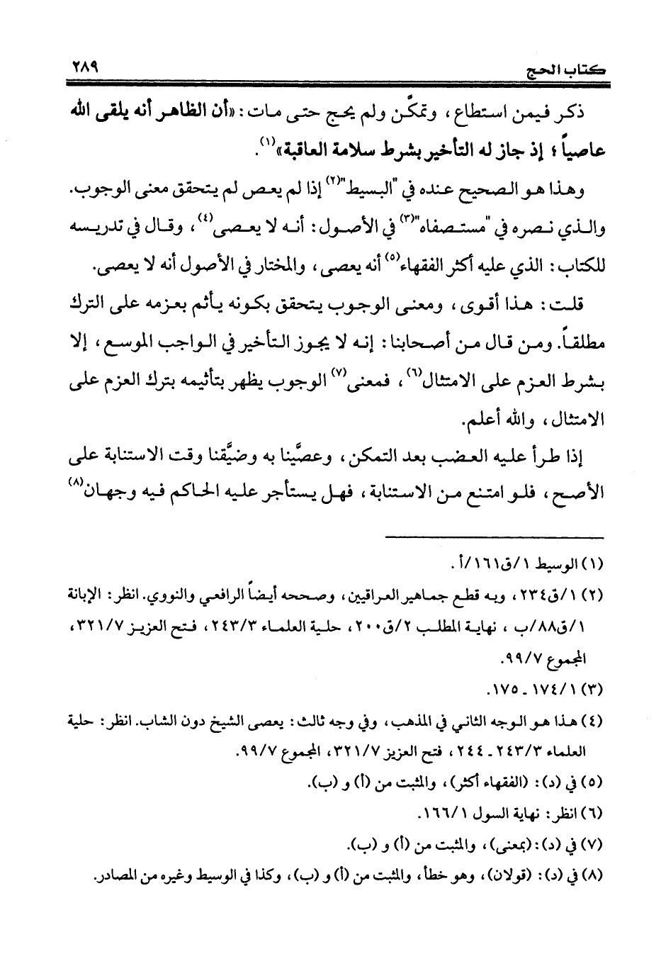 ذكر فيمن استطاع، وتمكَّن ولم يحج حتى مات: "أن الظاهر أنّه يلقى الله عاصياً؛ إذ جاز له التأخير بشرط سلامة العاقبة" (¬1).