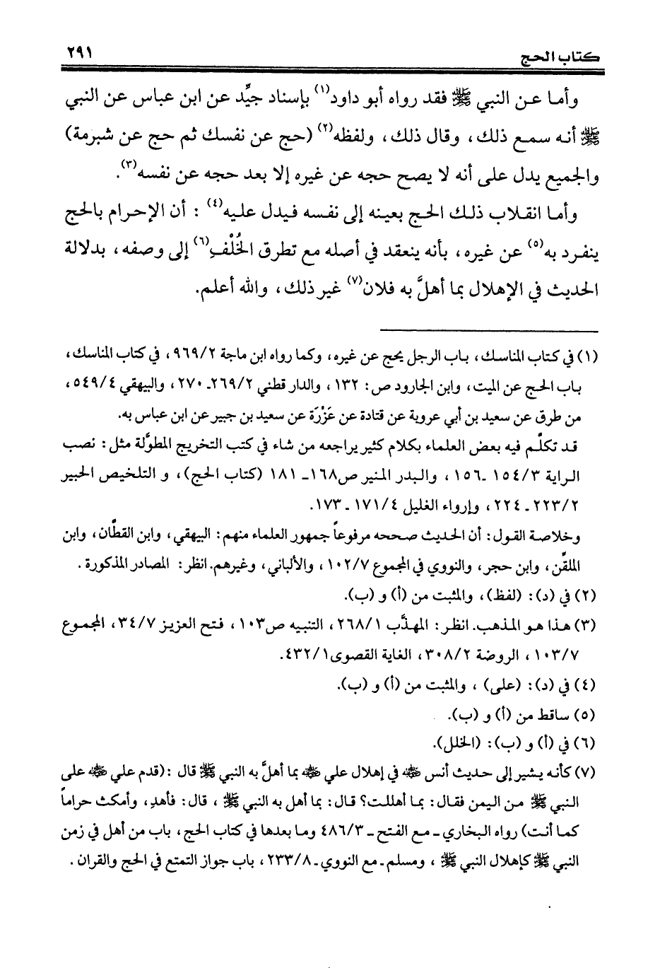 (¬7) كأنّه يشير إلى حديث أنس - رضي الله عنه - في إهلال علي - رضي الله عنه - بما أهلَّ به النبي - صلّى الله عليه وسلم - قال: (قدم علي -رضي الله عنه - على النبي - صلى الله عليه وسلم - من اليمن فقال: بما أهللت؟ قال: بما أهل به النبي - صلى الله عليه وسلم -، قال: فأهدِ، وأمكث حراماً كما أنت) رواه البخاري - مع الفتح - 3/ 486 وما بعدها في كتاب الحج، باب من أهل في زمن النبي - صلى الله عليه وسلم - كإهلال النبي - صلى الله عليه وسلم -، ومسلم - مع النووي - 8/ 233، باب جواز التمتع في الحج والقران.