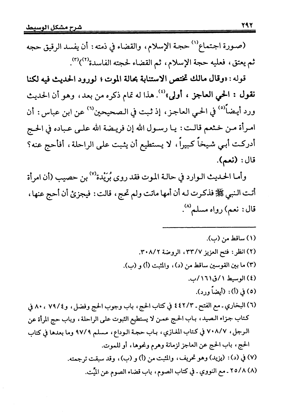 قوله: "وقال مالك تختص الاستنابة بحالة الموت؛ لورود الحديث فيه لكنا نقول: الحي العاجز، أولى" (¬4). هذا له تمام ذكره من بعد، وهو أن الحديث ورد أيضاً (¬5) في الحي العاجز، إذ ثبت في الصحيحين (¬6) عن ابن عباس: أن امرأة من خثعم قالت: يا رسول الله إنَّ فريضة الله على عباده في الحج أدركت أبي شيخاً كبيراً، لا يستطيع أن يثبت على الراحلة، أفأحج عنه؟ قال: (نعم).
