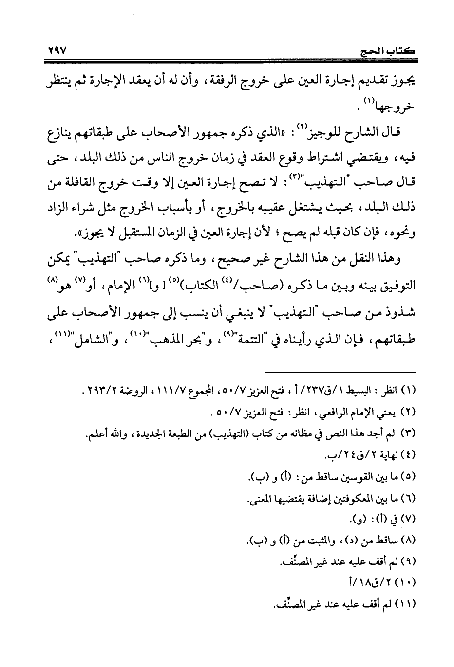 قال الشارح للوجيز (¬2): "الذي ذكره جمهور الأصحاب على طبقاتهم ينازع فيه، ويقتضي اشتراط وقوع العقد في زمان خروج الناس من ذلك البلد، حتى قال صاحب "التهذيب" (¬3): لا تصح إجارة العين إلا وقت خروج القافلة من ذلك البلد، بحيث يشتغل عقيبه بالخروج، أو بأسباب الخروج مثل شراء الزاد ونحوه، فإن كان قبله لم يصح؛ لأنّ إجارة العين في الزمان المستقبل لا يجوز".