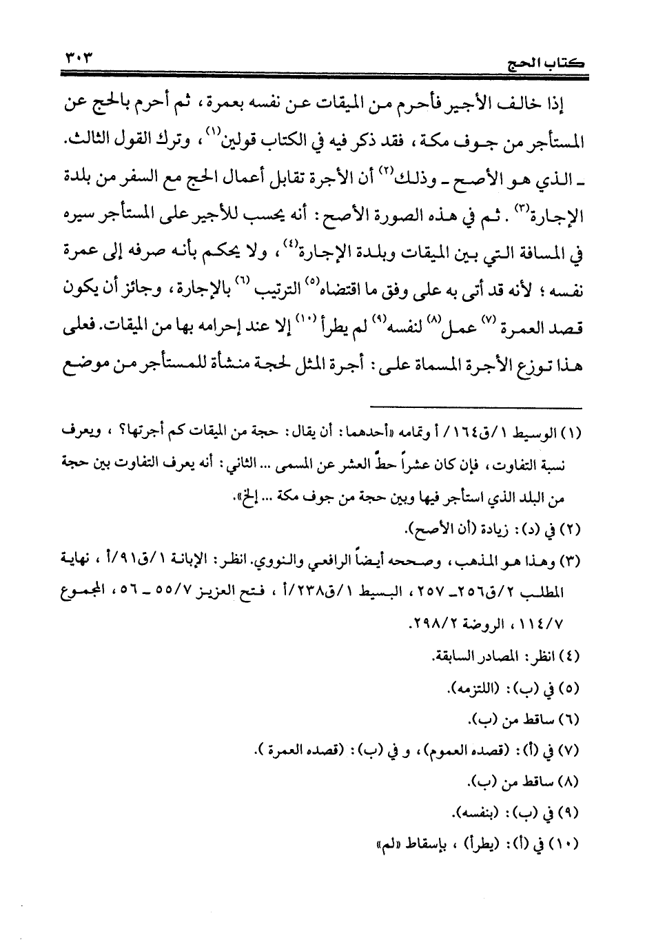 (¬1) الوسيط 1/ ق 164/ أوتمامه "أحدهما: أن يقال: حجة من الميقات كم أجرتها؟، ويعرف نسبة التفاوت، فإن كان عشراً حطَّ العشر عن المسمى ... الثاني: أنّه يعرف التفاوت بين حجة من البلد الذي استأجر فيها وبين حجة من جوف مكة ... إلخ".
